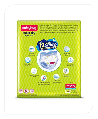 Soft & Comfortable Cottony Soft & Breathable Material: Helps to protect baby's sensitive skin Soft & Flexible Waist Band: Super Stretchy flexible elastic adapts to the baby's waist to give a comfortable fit 12 hours Dryness Zig zag technology Anti Rash & Gentle Anti-Rash Shield: Prevents risk of diaper rashes 3D leak guard Brand - Babyhug Type - Diapers Stretch the Waist Band Of Diaper By Both Hands Widen Legs Of Baby & Insert Diaper Pull Up the Diaper Babyhug Pant Style Diaper comes with zig zag channel technology which helps in even flow quick absorption and dryness upto 12 hours. This special technology helps prevent heaviness of the diaper which is very important for your baby's comfort. The feather soft material and flexible waist band further enhances the comfort for your loved one.