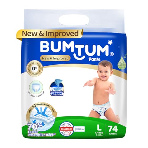 Bumtum Baby Diaper Pants, Large Size, 74 Count, Double Layer Leakage Protection Infused With Aloe Vera, Cottony Soft High Absorb Technology