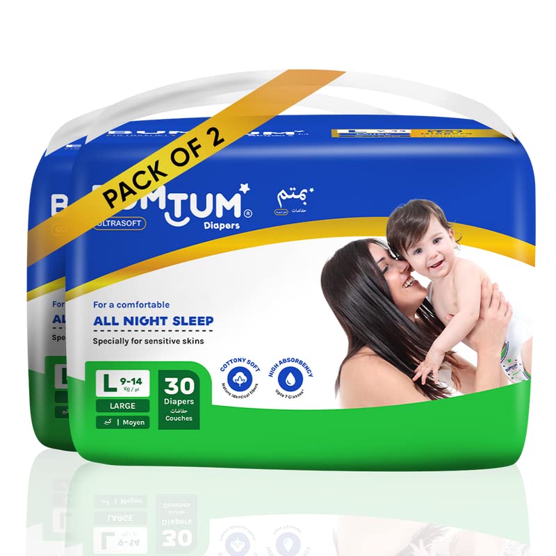 Bumtum Baby Taped Diapers Large Size 60 Count 12 Hrs Leakage Protection Infused With Aloe Vera Cottony Soft High Absorb Technology (Pack of 2)