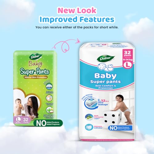 Dabur Baby Super Pants is a natural skin protection diaper exclusive for baby sensitive skin. It is infused with Aloe-vera Shea butter & Vitamin E to keep redness & rashes away. The diaper is designed with new Insta Absorb technology for high absorbency & 12 hrs zero leakage that help baby have a sound sleep all night long. The magic gel locks wetness & keeps skin dry overnight. The diaper enables a comfortable fit with its 360 stretch fit design for easy wear & movement. Available in sizes small diaper pants medium diaper pants & large size diaper pants.