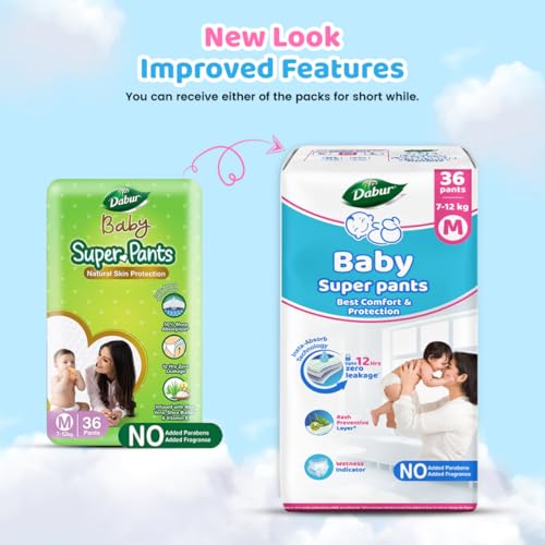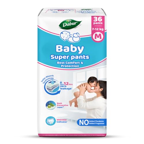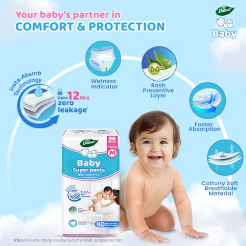 Dabur Baby Super Pants is a natural skin protection diaper exclusive for baby sensitive skin. It is infused with Aloe-vera Shea butter & Vitamin E to keep redness & rashes away. The diaper is designed with new Insta Absorb technology for high absorbency & 12 hrs zero leakage that help baby have a sound sleep all night long. The magic gel locks wetness & keeps skin dry overnight. The diaper enables a comfortable fit with its 360 stretch fit design for easy wear & movement. Available in sizes small diaper pants medium diaper pants & large size diaper pants.