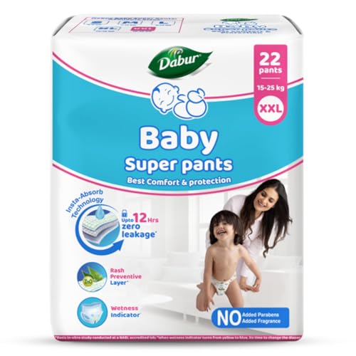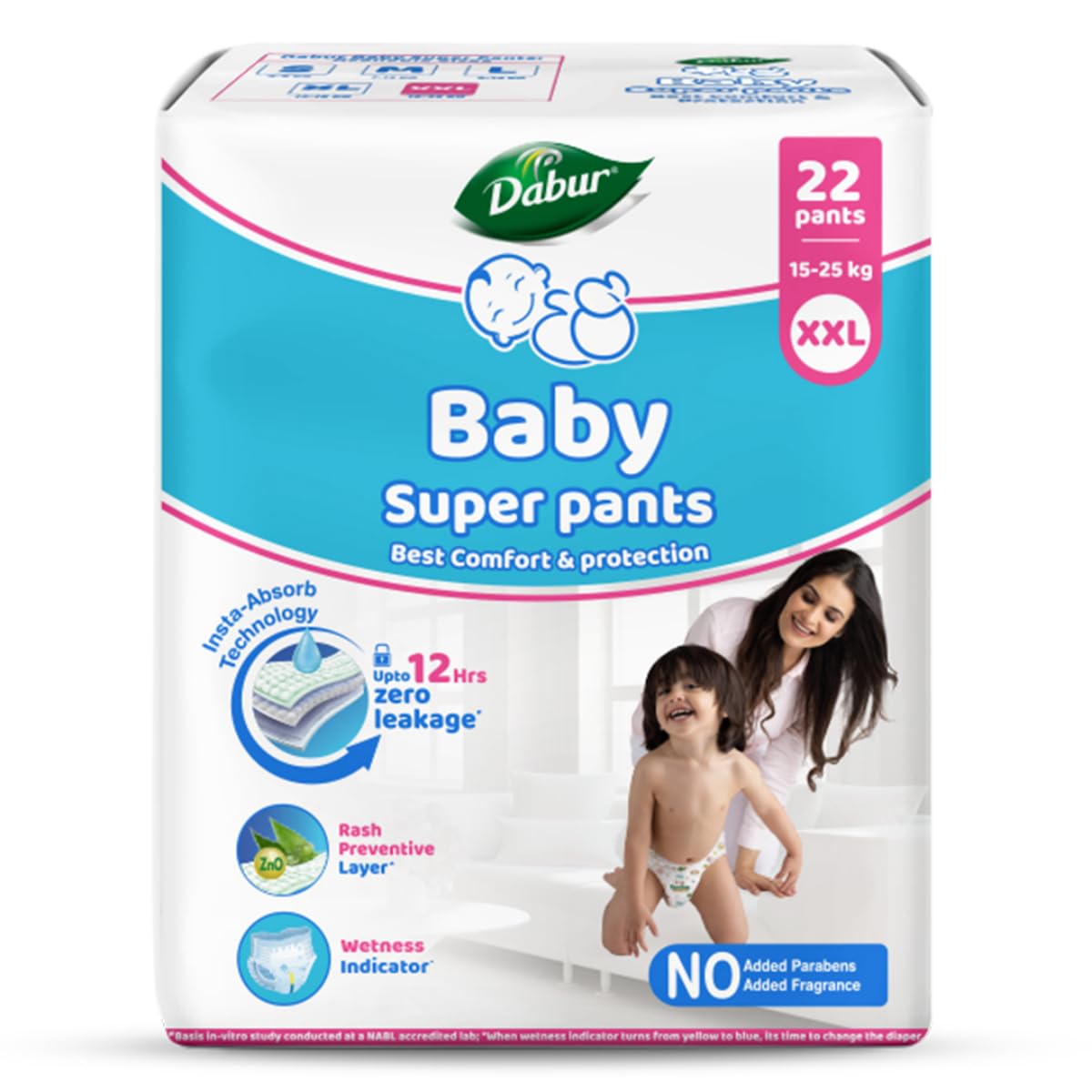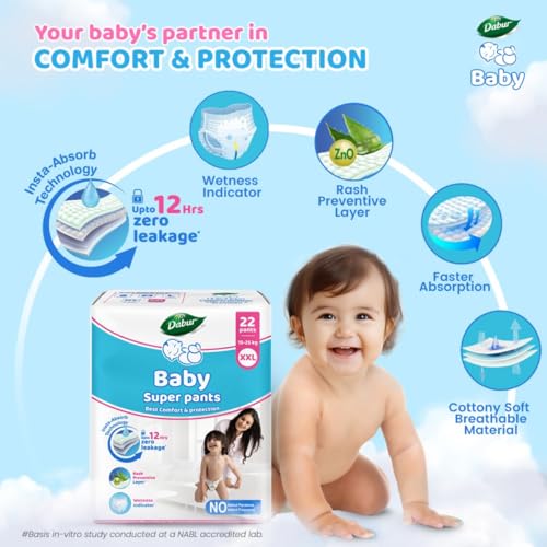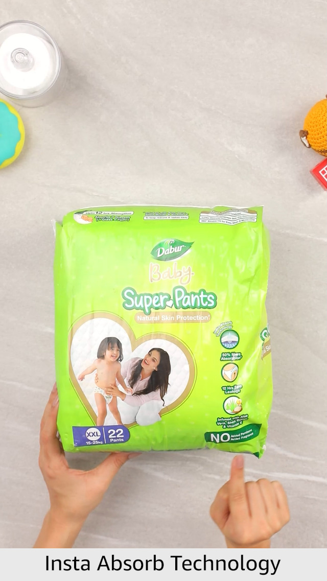 Dabur Baby Super Pants is a natural skin protection diaper exclusive for baby sensitive skin. It is infused with Aloe-vera Shea butter & Vitamin E to keep redness & rashes away. The diaper is designed with new Insta Absorb technology for high absorbency & 12 hrs zero leakage that help baby have a sound sleep all night long. The magic gel locks wetness & keeps skin dry overnight. The diaper enables a comfortable fit with its 360 stretch fit design for easy wear & movement. Available in sizes small diaper pants medium diaper pants & large size diaper pants.