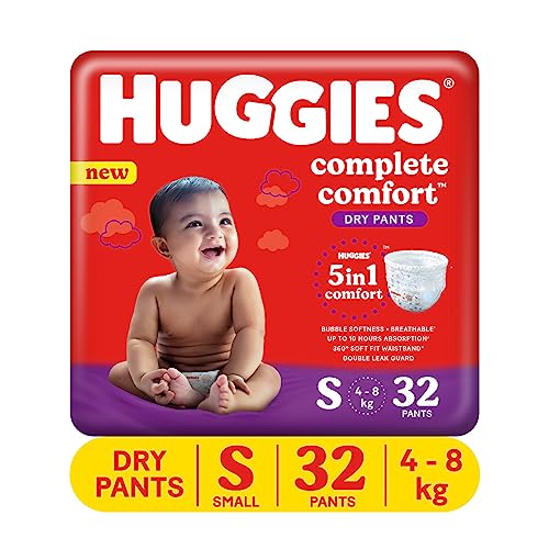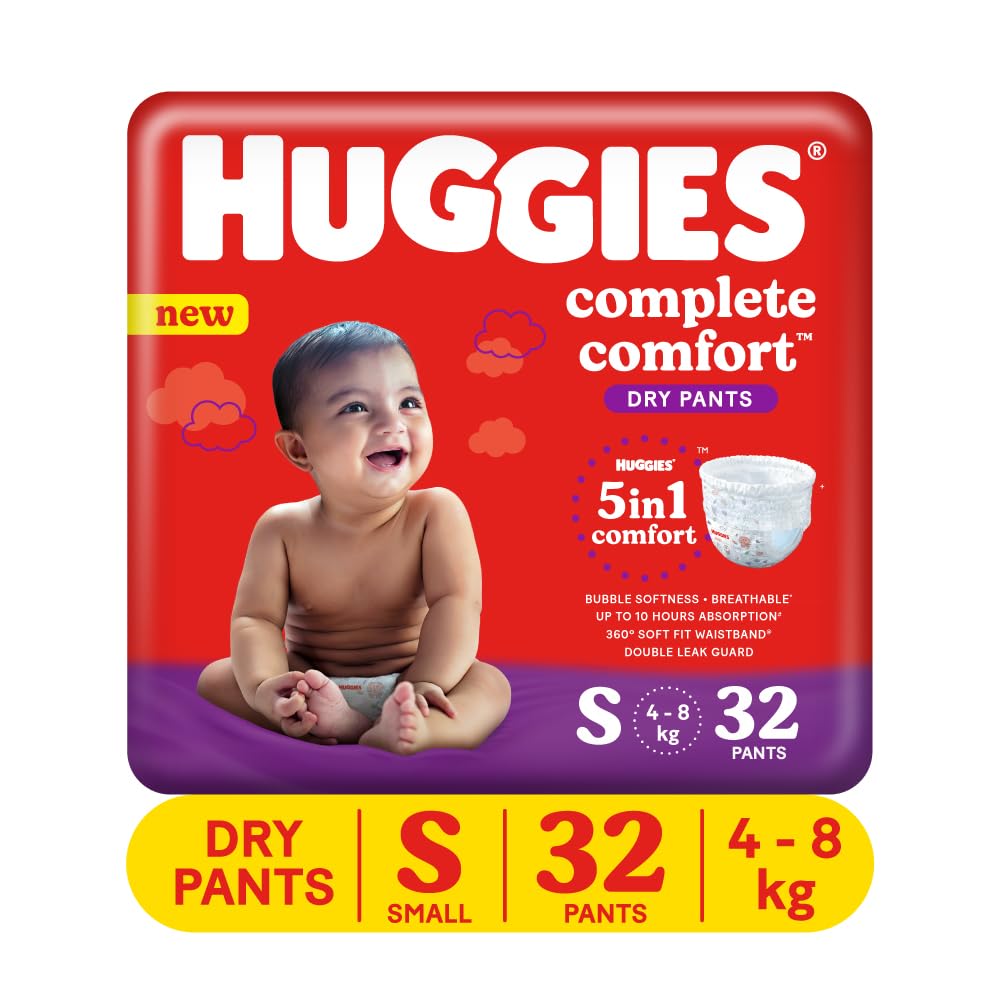 Huggies Complete Comfort Dry Pants Small (S) Size Baby Diaper Pants, 32 count, with 5 in 1 Comfort