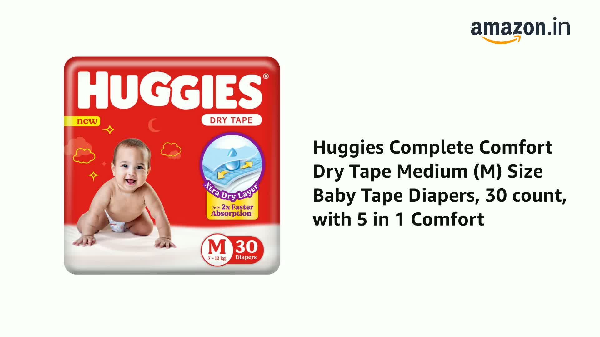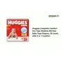 Huggies Complete ComfortTM Dry Tape provides 5 benefits in 1 diaper. Its Adjustable waistband ensures a snug fit and fights red marks. Made from air friendly material our diapers help your baby's skin to breathe. Up to 12 Hours of Overnight Absorption allows you and your baby to have a comfortable sleep. Double leak guard provides extra padding to prevent thigh leakage and has cotton like softness for your baby's delicate skin. Our Tape style diapers are available in all sizes from Newborn-Small Medium and Large sizes.