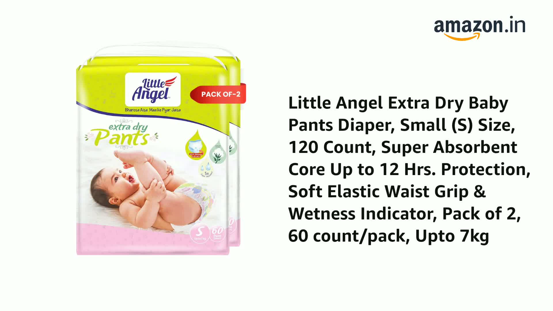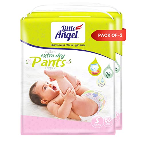 HomeBabyDiaperingBaby DiapersLittle Angel Extra Dry Baby Pants Diaper, Small (S) Size, 120 Count, Super Absorbent Core Up to 12 Hrs. Protection, Soft Elastic Waist Grip & Wetness Indicator, Pack of 2, 60 count/pack, Upto 7kg