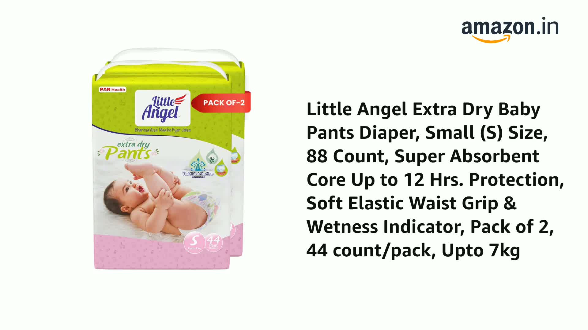 HomeBabyDiaperingBaby DiapersLittle Angel Extra Dry Baby Pants Diaper, Small (S) Size, 88 Count, Super Absorbent Core Up to 12 Hrs. Protection, Soft Elastic Waist Grip & Wetness Indicator, Pack of 2, 44 count/pack, Upto 7kg