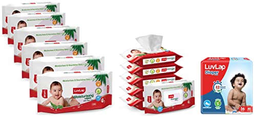 LuvLap Baby Diaper Pants M Size (Medium) with Aloe Vera Lotion for rash protection Pack of 72 Count with upto 12Hr protection For babies of 7 to 12KgAvailable sizes - Newborn (upto 5Kg) Small (4-8 Kg) Medium (7-12Kg) Large (9-14Kg) XL (12-17Kg)LuvLap Paraben Free wipes for baby skin with Aloe Vera Fragrance Free pH Balanced Dermatologically Safe Baby Wipes Rich in Vitamin E & chamomile extract 72 Wipes / Pack 6 PacksLuvLap moisturizing baby wipes with aloe vera are the perfect wipes for your baby's delicate skin. Enriched with the goodness of aloe vera and chamomile they are completely free of alcohol and harmful parabens. After all your baby's safety is our prime concern.LuvLap Paraben Free Baby Wipes with Aloe Vera with Fliptop Lid (72 Wipes/Pack Pack of 6)LuvLap moisturizing baby wipes with aloe vera are the perfect wipes for your baby's delicate skin. Enriched with the goodness of aloe vera and chamomile they are completely free of alcohol and harmful parabens. The pack also comes with a lid seal to ensure the quality remains consistent over time. After all your baby's safety is our prime concern.