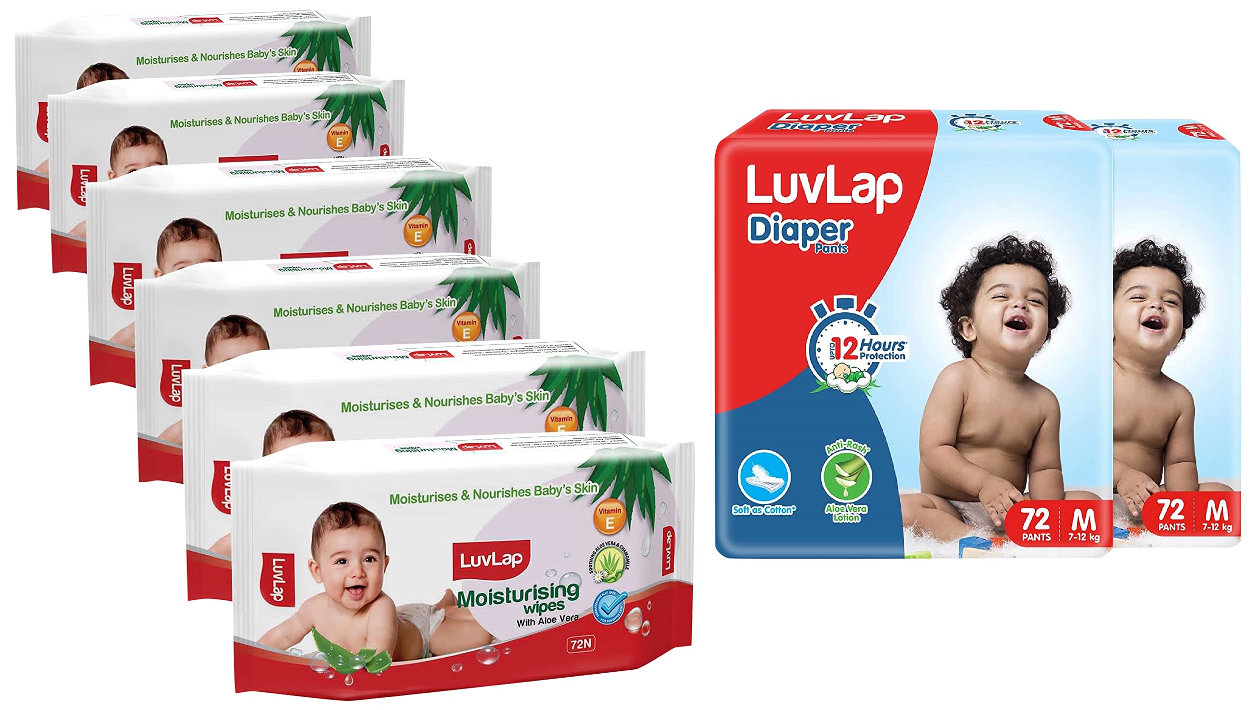 LuvLap Baby Diaper Pants M Size (Medium) with Aloe Vera Lotion for rash protection Pack of 144 Count (72x2) with upto 12Hr protection For babies of 7 to 12Kg Jumbo packAvailable sizes - Newborn (upto 5Kg) Small (4-8 Kg) Medium (7-12Kg) Large (9-14Kg) XL (12-17Kg)LuvLap Paraben Free wipes for baby skin with Aloe Vera Fragrance Free pH Balanced Dermatologically Safe Baby Wipes Rich in Vitamin E & chamomile extract 72 Wipes / Pack 6 PacksLuvLap moisturizing baby wipes with aloe vera are the perfect wipes for your baby's delicate skin. Enriched with the goodness of aloe vera and chamomile they are completely free of alcohol and harmful parabens. After all your baby's safety is our prime concern.