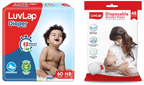 LuvLap Baby Diaper Pants New Born Size (NB) with Aloe Vera Lotion for rash protection Pack of 60 Count with upto 12Hr protection For babies of Upto 5Kg Extra Small (XS)Available sizes - Newborn (upto 5Kg) Small (4-8 Kg) Medium (7-12Kg) Large (9-14Kg) XL (12-17Kg)LuvLap Ultra Thin Honeycomb Nursing Breast Pads 48pcs Disposable High Absorbent Discreet FitLuvlap breast pads 48's pack super absorbent pad quickly absorbs excessive breast milk and locks in moisture for optimum dryness and comfort.