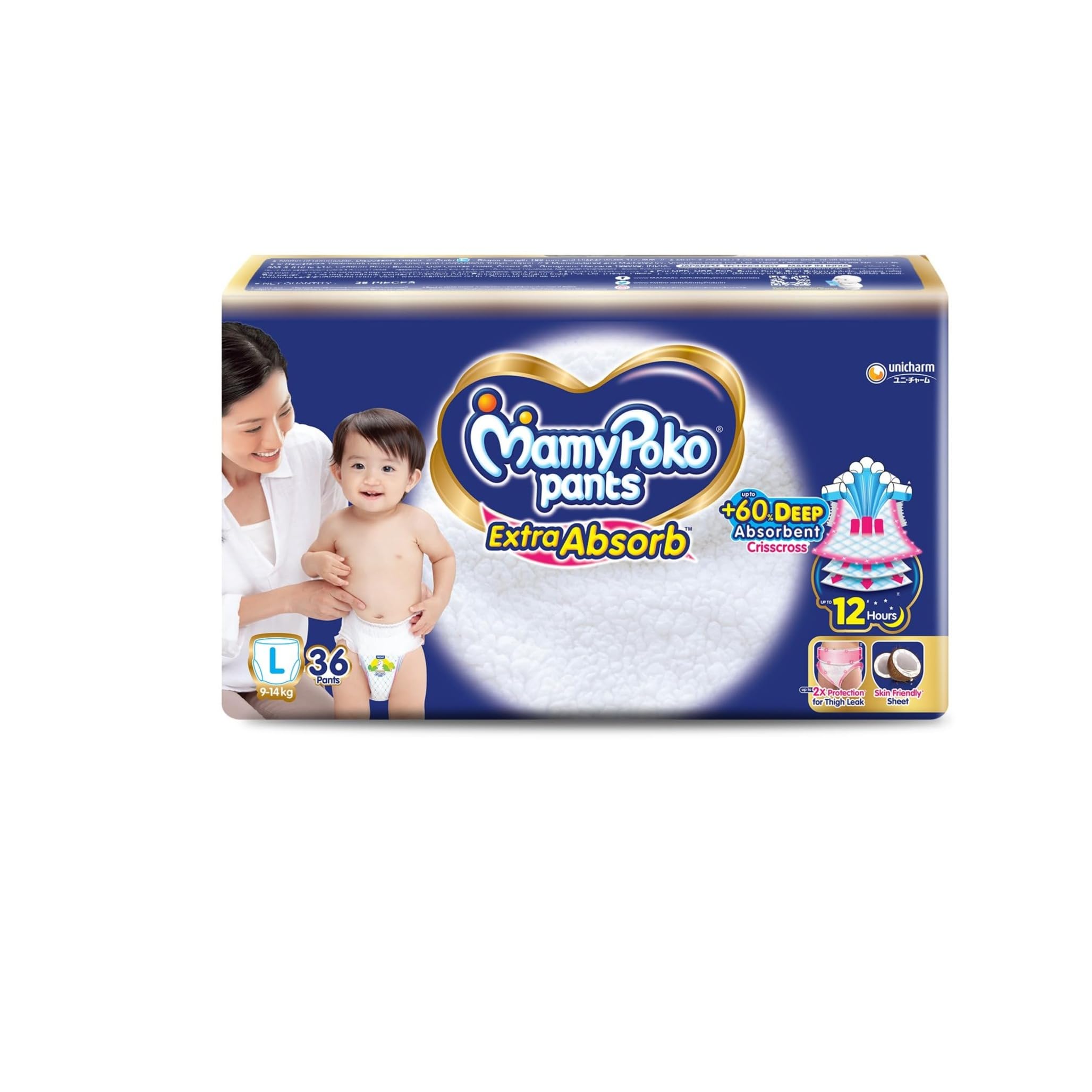 Best 12 hours absorbent pants ever in MamyPoko product history in India has +60% Deep Absorbent CrissCross with extra 3rd layer that absorbs urine deeply and provides 2x protection for thigh leakage without sogginess whole night so baby & mother can sleep deeply whole night".