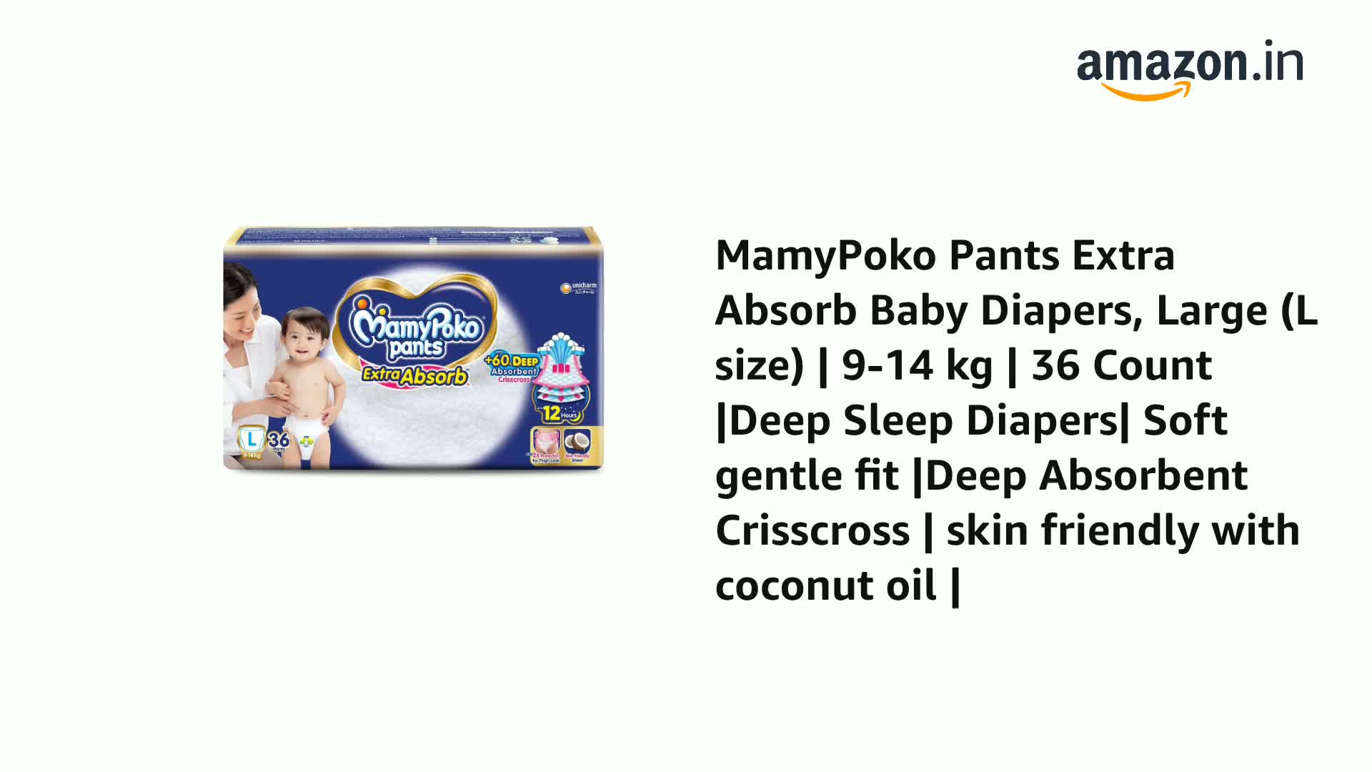 MamyPoko Pants Extra Absorb Baby Diapers, Large (L size) | 9-14 kg | 36 Count |Deep Sleep Diapers| Soft gentle fit |Deep Absorbent Crisscross | skin friendly with coconut oil |