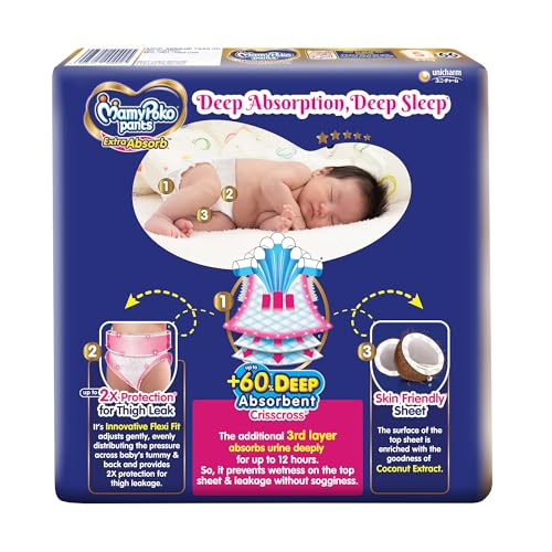 Best 12 hours absorbent pants ever in MamyPoko product history in India has +60% Deep Absorbent CrissCross with extra 3rd layer that absorbs urine deeply and provides 2x protection for thigh leakage without sogginess whole night so baby & mother can sleep deeply whole night".