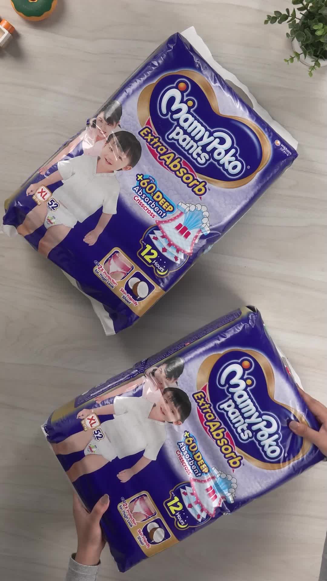 Best 12 hours absorbent pants ever in MamyPoko product history in India has +60% Deep Absorbent CrissCrosswith extra 3rd layer that absorbs urine deeply and provides 2x protection for thigh leakage without sogginess whole night so baby & mother can sleep deeply whole night".