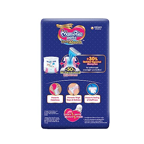 MamyPoko Pants Extra Absorb comes with new "Widespread Crisscross Sheet" with 50% extra absorption area on sides that absorbs urine quickly and repeatedly for upto 12 hours. It prevents leakage without heaviness so the baby & mother sleep peacefully the whole night.