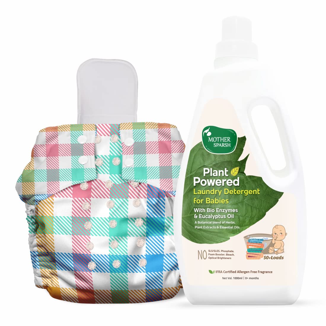 Mother Sparsh Combo of Plant Powered Baby Laundry Liquid Detergent 1 Ltr with Nappers Cloth Diaper with 1 Hybrid Super Absorbent Soaker Pad (Mast Melon)