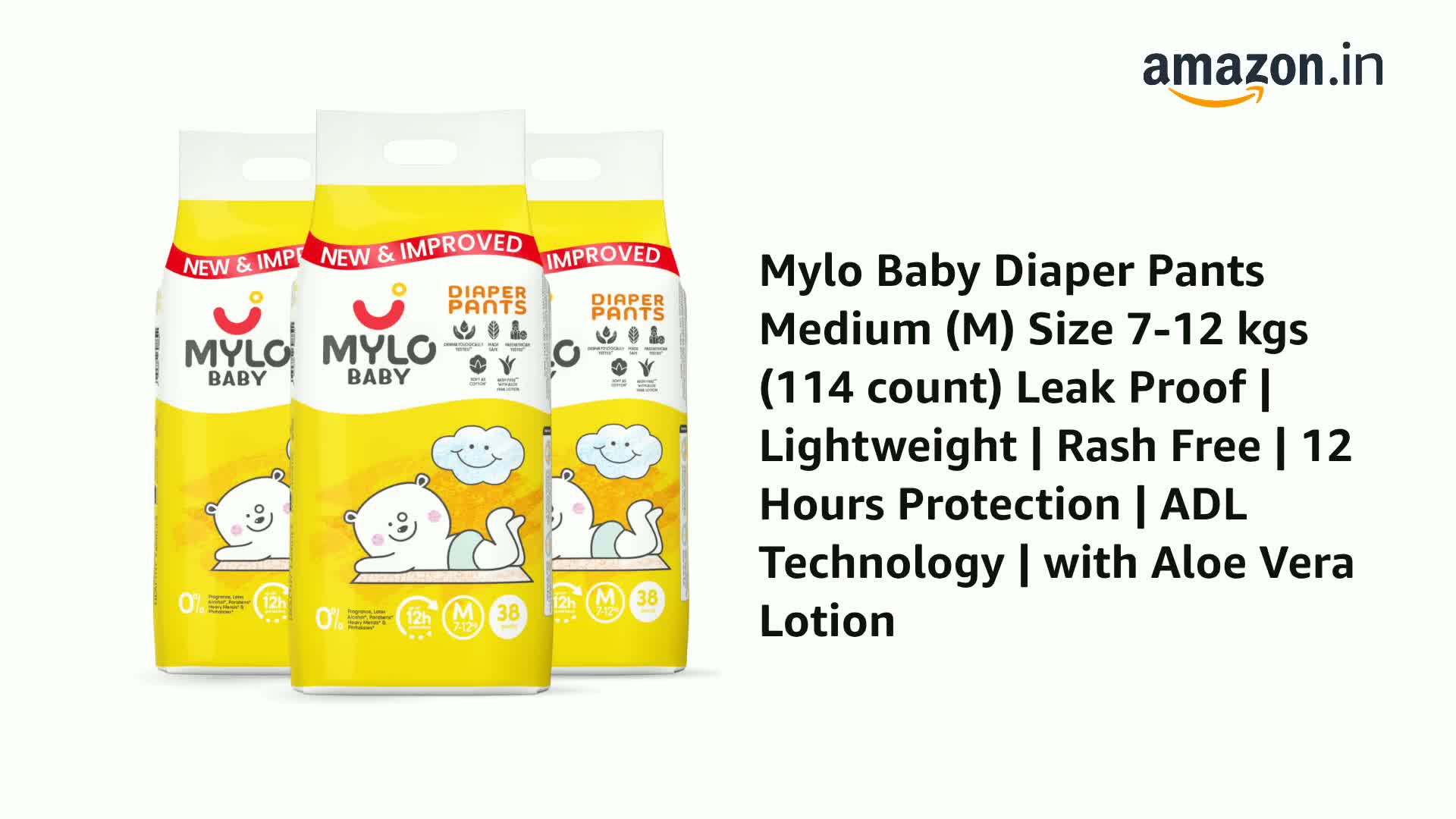 Mylo Baby Diaper Pants Medium (M) Size 7-12 kgs (114 count) Leak Proof | Lightweight | Rash Free | 12 Hours Protection | ADL Technology | with Aloe Vera Lotion