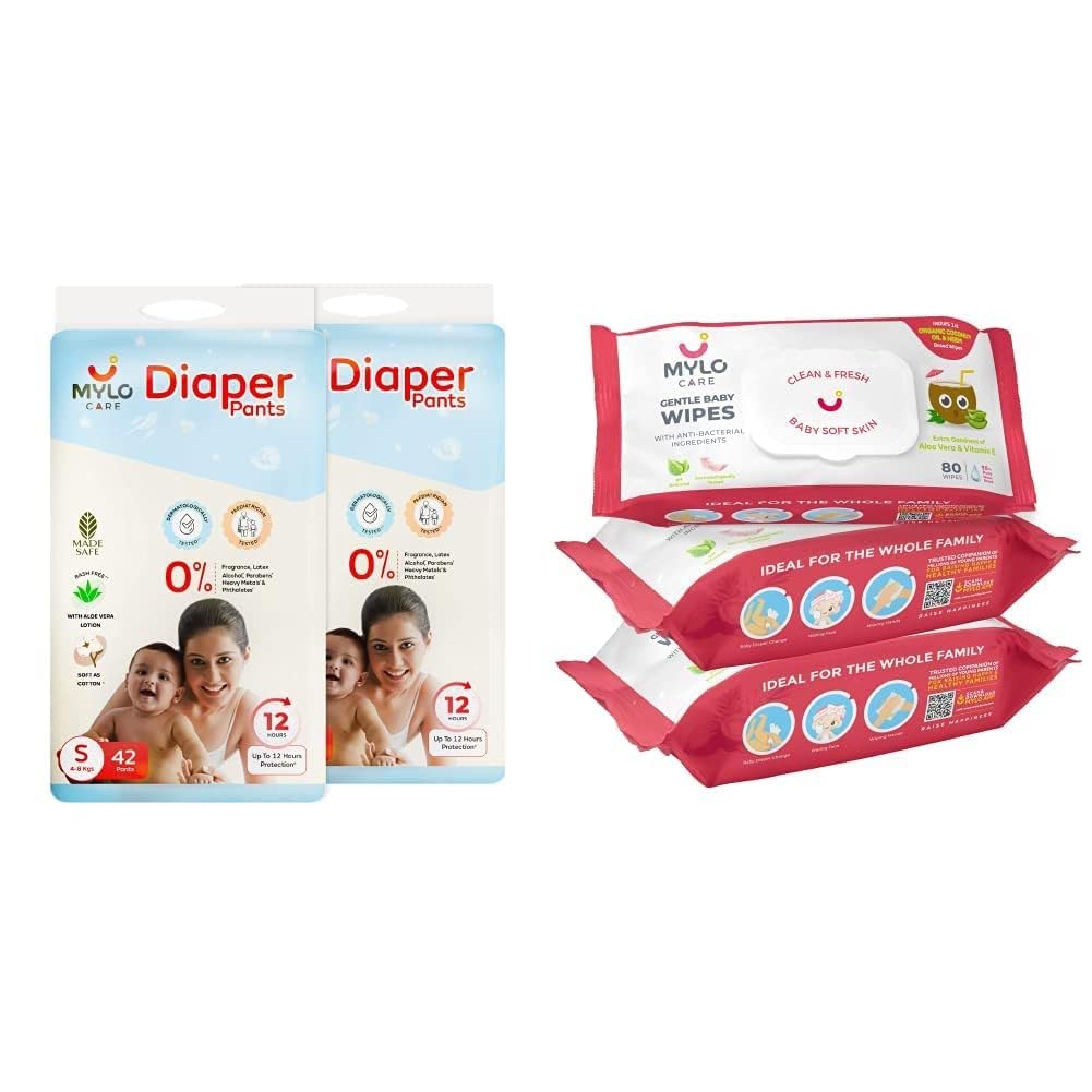 A Pocket-Friendly Solution to Your Baby's Comfort & Hygiene WHAT IT IS- A super saver combo pack that can actually make your monthly diapering needs go smooth convenient & effective. Once stocked you will never run out of diapers or wipes. This Monthly Super Saver Combo is designed considering the hygiene needs of your child & is budget- friendly too. Be it at home while traveling or at any other outdoor place all you need is Myloâs diapering combo with Indiaâs first baby wet wipes with organic coconut oil & organic aloe vera & Mylo Care Baby Diaper Pants to clean your baby & offer leakage prevention for up to 12 hours. HOW IS OUR PRODUCT DIFFERENT? This unique combo takes care of your babyâs comfort and hygiene. Being 100% chemical free both our diaper and wipes are safe to use even for a newborn. The wipes have multiple uses and can be used by the entire family both indoor & outdoor. The disposable diaper pants are soft & light and provide 12 hours of leak protection. WHY MYLO CARE? All our products are committed to be in harmony with our mission statement of âPersonal Care Range for Your Precious World Internationally Certified All Natural Toxin Free.â At Mylo we aim to provide you and your loved ones with certified and safe anti-allergy products to ensure the best results.