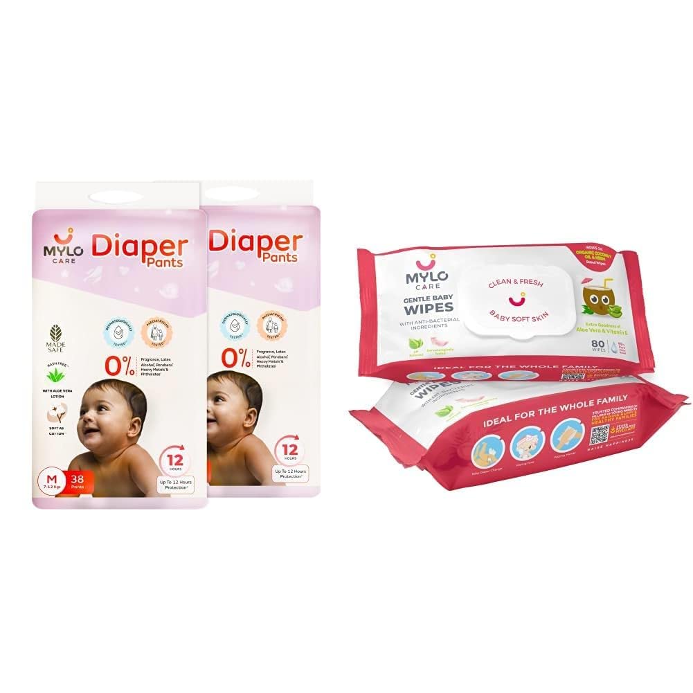 A Pocket-Friendly Solution to Your Baby's Comfort & Hygiene WHAT IT IS- A super saver combo pack that can actually make your monthly diapering needs go smooth convenient & effective. Once stocked you will never run out of diapers or wipes. This Monthly Super Saver Combo is designed considering the hygiene needs of your child & is budget- friendly too. Be it at home while traveling or at any other outdoor place all you need is Myloâs diapering combo with Indiaâs first baby wet wipes with organic coconut oil & organic aloe vera & Mylo Care Baby Diaper Pants to clean your baby & offer leakage prevention for up to 12 hours. HOW IS OUR PRODUCT DIFFERENT? This unique combo takes care of your babyâs comfort and hygiene. Being 100% chemical free both our diaper and wipes are safe to use even for a newborn. The wipes have multiple uses and can be used by the entire family both indoor & outdoor. The disposable diaper pants are soft & light and provide 12 hours of leak protection. WHY MYLO CARE? All our products are committed to be in harmony with our mission statement of âPersonal Care Range for Your Precious World Internationally Certified All Natural Toxin Free.â At Mylo we aim to provide you and your loved ones with certified and safe anti-allergy products to ensure the best results.