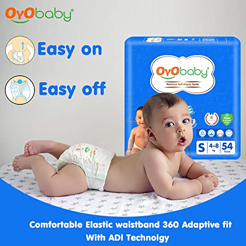 HomeBabyDiaperingBaby DiapersOYO BABY Pant Style Baby Diapers, Pack of 2 - Small (S), 54Count, for Babies 4-8kg, with Aloe Vera Lotion for Rash Protection & Up to 12 Hours Protection