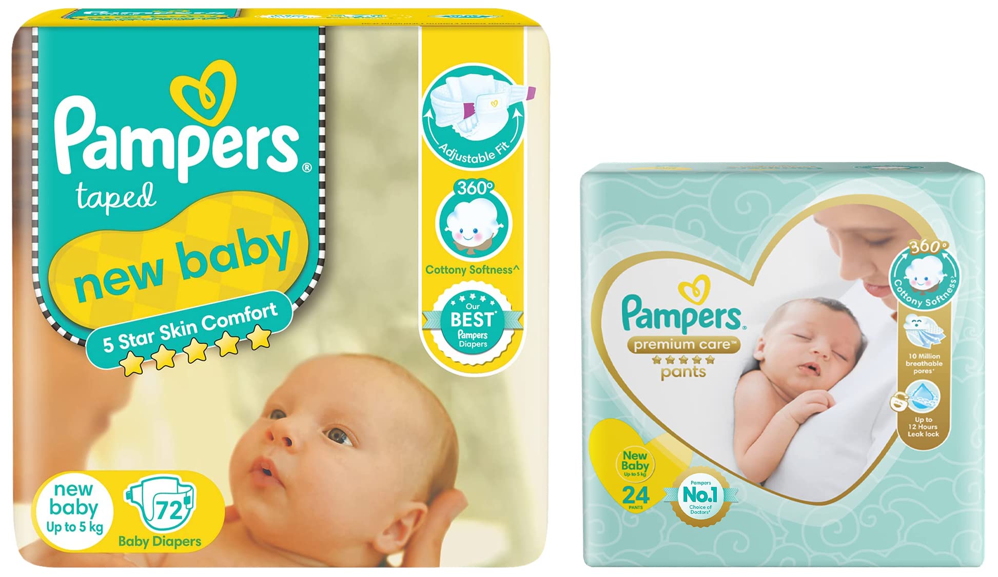 Pampers Active Baby Diapers New Born Extra Small (NB XS) size 72 Count Taped style diaperNEW & IMPROVED Pampers all-round protection pants have ANTI-RASH BLANKET* containing Lotion with Aloe Vera to keep your baby skin protected from redness irritation and rashes. quality diapers with 100% WETNESS LOCK keeps the pee locked inside & baby's bum stays dry for ALL NIGHT. Air channels & stretchy belt provides your baby breathable airy fit - comfortable even in summers. Pampers unique Magic gel technology provides up to 12 hours of dryness and has 2X faster absorption. The new and improved product design enables a comfortable fit closer to the baby body and an EXTRA SOFT flexible waist band that adapts to baby movements for best comfort. Available in all sizes Small diapers medium diaper pants large size diaper pants XL diapers XXL diapers XXXL diaper pants. A top layer with cotton-like soft material ensure a comfortable night sleep. Our pants with fun exterior graphics fun designs of characters and a delightful fresh Aloe fragrance ensures you enjoy every change with your baby. (*Blanket refers to soft topsheet with lotion. Helps prevent rash due to wetness after 1 day of usage based on clinical studies in USA 2000-2019).Pampers Premium Care Pants New Born Extra Small size baby Diapers (NB/XS) 24 count Softest ever PampersNew Pampers Premium Care Pants with 360 degree cottony softness gives your baby the ultimate comfort all day all night long. Pampers Premium Care Pants contain soothing lotion with Aloe Vera to protect your baby skin from rashes while its 10 million micropores allow your baby skin to breathe. Its 12-hour leak lock facility keeps your baby dry and away from wetness. Experience 5-Star comfort with unique added features like Wetness Indicator which turns Yellow to Blue indicating when you may change the diaper and a Disposal Tape to help you with easy disposal. Pampers Premium Pants are available in New-born (NB) S M L XL and XXL sizes.
