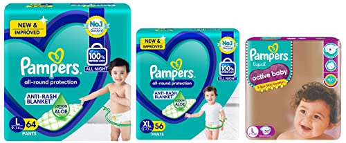 Pampers Active Baby Taped Diapers & All round Protection Pants Extra Large size baby Diapers (XL) 56 Count Lotion with Aloe Vera & All round Protection Pants Large size baby Diapers