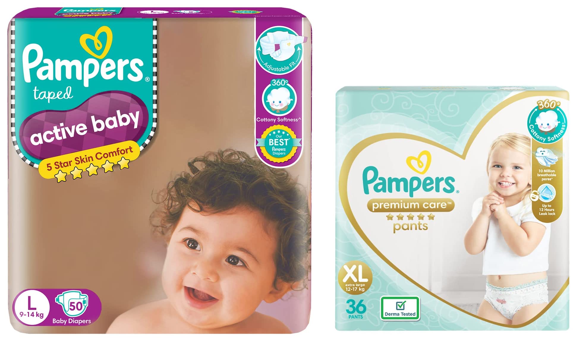 Pampers Active Baby Taped Diapers Large size diapers (LG) 50 count taped style custom fitYour little miracle deserves gentle protection & full night’s sleep – and mothers & doctors have always trusted Pampers to provide the care. Presenting New Pampers Active Baby taped diapers which provides your baby 5 star skin protection! How you ask? It has an Adjustable Taped Fit which you can custom-fit as per your baby’s need. The sides & waist are stretchable with 360 Degree Cottony Softness providing best comfort for your baby’s skin. Its Extra Dry Layer helps prevent leakage by spreading baby’s urine evenly and Pampers unique Magic Gel technology absorbs baby’s pee full night for up to 12 hrs. This is how these are Our Best Pampers Taped Diapers ever! Taped diapers adjustable custom fit cottony soft 12 hrs absorption best Pampers. Keep your baby's skin delicate with 5 star skin protection. Pampers Active Baby comes with 5 features in just one diaper. 12 hours dryness baby lotion cottony softness breathable cover and comfortable fit. 12 Hours Dryness Our driest diaper keeps baby's skin touchably dry for up to 12 hours. Baby Lotion This unique diaper is infused with baby lotion to help prevent diaper rash. Cottony Softness Keep baby's skin free from irritation with cotton-like softness. Breathable Cover Air circulates so baby's skin can breathe easily and stay wonderfully fresh. Comfortable Fit A flexible side stretch design keeps it snug and comfy whether baby is at rest or play. Diaper Sizer Five Features in One Diaper View Larger Comparison Chart View Larger Using Pampers Pants When to Change Right before or right after every feeding After every bowel movement Before bedtime When your baby wakes up When you go out with your baby How to Change Put the diaper under the baby's body. Pull the elastic side properly. Apply both sides in symmetrical position on landing zone. Adjust the cuff around legs on both sides.Pampers Premium Care Pants Extra Large size baby Diapers (XL) 36 Count Softest ever Pampers PantsNew Pampers Premium Care Pants with 360 degree cottony softness gives your baby the ultimate comfort all day all night long. Pampers Premium Care Pants contain soothing lotion with Aloe Vera to protect your baby’s skin from rashes while its 10 million micropores allow your baby’s skin to breathe. Its 12-hour leak lock facility keeps your baby dry and away from wetness. Experience 5-Star comfort with unique added features like Wetness Indicator which turns Yellow to Blue indicating when you may change the diaper and a Disposal Tape to help you with easy disposal. Pampers Premium Pants are available in New-born (NB) S M L XL and XXL sizes.