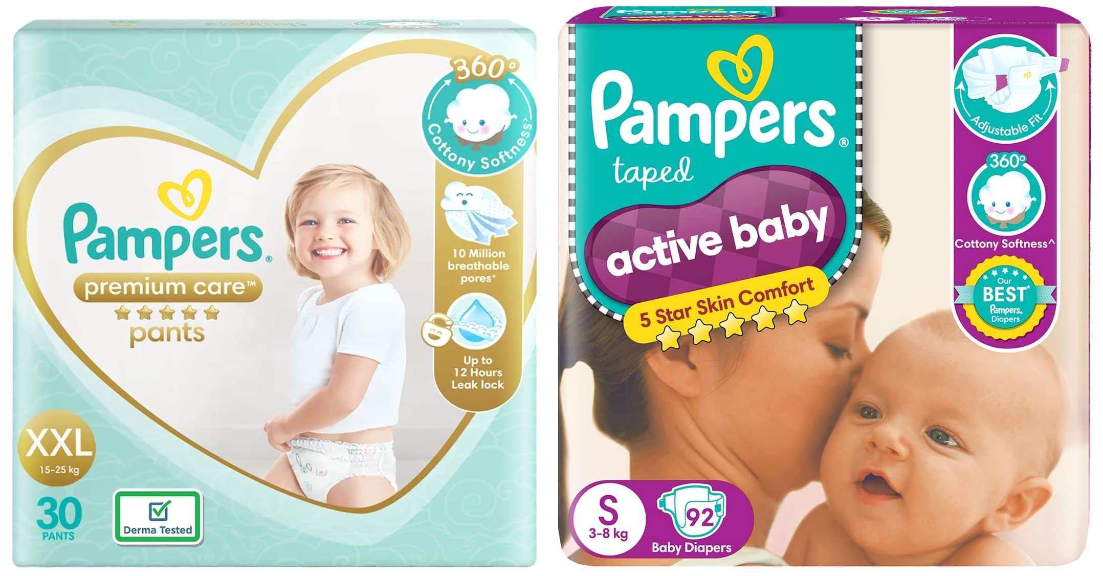 Pampers Active Baby Taped Diapers Small size diapers (SM) 92 count taped style custom fitYour little miracle deserves gentle protection & full night’s sleep – and mothers & doctors have always trusted Pampers to provide the care. Presenting New Pampers Active Baby taped diapers which provides your baby 5 star skin protection! How you ask? It has an Adjustable Taped Fit which you can custom-fit as per your baby’s need. The sides & waist are stretchable with 360 Degree Cottony Softness providing best comfort for your baby’s skin. Its Extra Dry Layer helps prevent leakage by spreading baby’s urine evenly and Pampers unique Magic Gel technology absorbs baby’s pee full night for up to 12 hrs. This is how these are Our Best Pampers Taped Diapers ever! Taped diapers adjustable custom fit cottony soft 12 hrs absorption best Pampers.Pampers Premium Care Pants Double Extra Large size baby Diapers (XXL) 30 Count Softest ever Pampers PantsNew Pampers Premium Care Pants with 360 degree cottony softness gives your baby the ultimate comfort all day all night long. Pampers Premium Care Pants contain soothing lotion with Aloe Vera to protect your baby’s skin from rashes while its 10 million micropores allow your baby’s skin to breathe. Its 12-hour leak lock facility keeps your baby dry and away from wetness. Experience 5-Star comfort with unique added features like Wetness Indicator which turns Yellow to Blue indicating when you may change the diaper and a Disposal Tape to help you with easy disposal. Pampers Premium Pants are available in New-born (NB) S M L XL and XXL sizes.