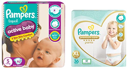 Pampers Active Baby Taped Diapers Small size diapers (SM) 92 count taped style custom fitYour little miracle deserves gentle protection & full night’s sleep – and mothers & doctors have always trusted Pampers to provide the care. Presenting New Pampers Active Baby taped diapers which provides your baby 5 star skin protection! How you ask? It has an Adjustable Taped Fit which you can custom-fit as per your baby’s need. The sides & waist are stretchable with 360 Degree Cottony Softness providing best comfort for your baby’s skin. Its Extra Dry Layer helps prevent leakage by spreading baby’s urine evenly and Pampers unique Magic Gel technology absorbs baby’s pee full night for up to 12 hrs. This is how these are Our Best Pampers Taped Diapers ever! Taped diapers adjustable custom fit cottony soft 12 hrs absorption best Pampers.Pampers Premium Care Pants Extra Large size baby Diapers (XL) 36 Count Softest ever Pampers PantsNew Pampers Premium Care Pants with 360 degree cottony softness gives your baby the ultimate comfort all day all night long. Pampers Premium Care Pants contain soothing lotion with Aloe Vera to protect your baby’s skin from rashes while its 10 million micropores allow your baby’s skin to breathe. Its 12-hour leak lock facility keeps your baby dry and away from wetness. Experience 5-Star comfort with unique added features like Wetness Indicator which turns Yellow to Blue indicating when you may change the diaper and a Disposal Tape to help you with easy disposal. Pampers Premium Pants are available in New-born (NB) S M L XL and XXL sizes.