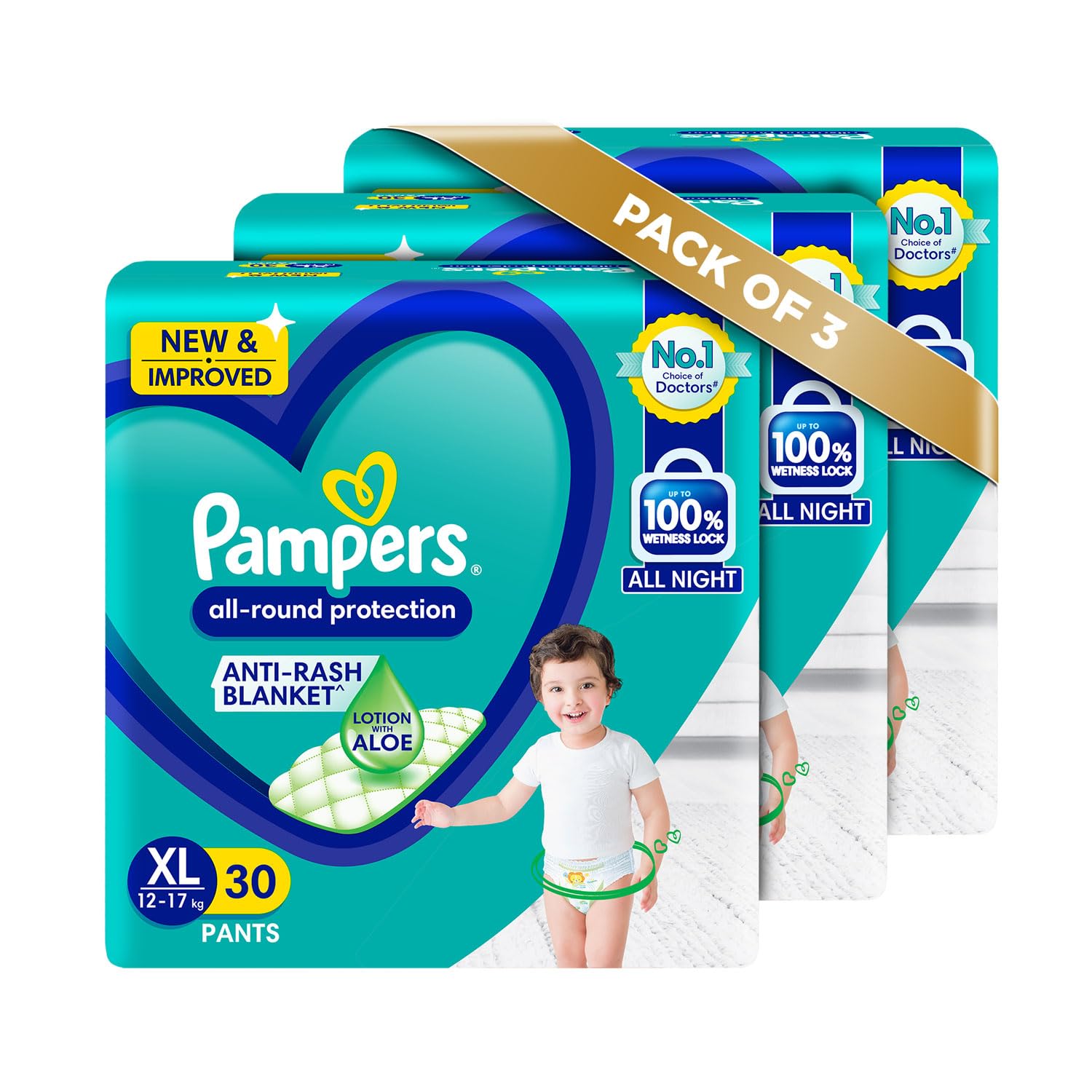 Pampers All round Protection Pants, Extra Large size baby Diapers, (12-17kg) 30 Count Lotion with Aloe Vera (Pack of 3)