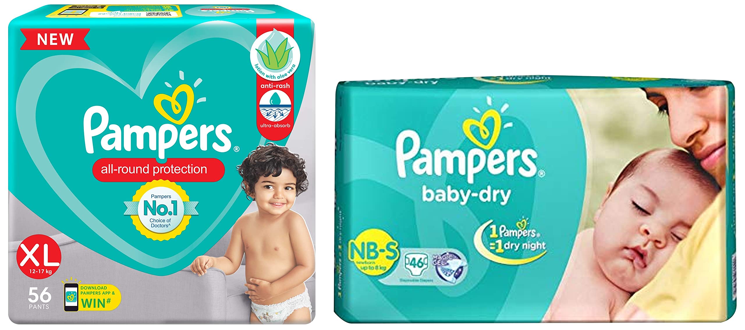 Pampers All round Protection Pants Extra Large size baby Diapers (XL) 56 Count Lotion with Aloe VeraNEW & IMPROVED Pampers all-round protection pants have ANTI-RASH BLANKET* containing Lotion with Aloe Vera to keep your baby skin protected from redness irritation and rashes. quality diapers with 100% WETNESS LOCK keeps the pee locked inside & baby's bum stays dry for ALL NIGHT. Air channels & stretchy belt provides your baby breathable airy fit - comfortable even in summers. Pampers unique Magic gel technology provides up to 12 hours of dryness and has 2X faster absorption. The new and improved product design enables a comfortable fit closer to the baby body and an EXTRA SOFT flexible waist band that adapts to baby movements for best comfort. Available in all sizes Small diapers medium diaper pants large size diaper pants XL diapers XXL diapers XXXL diaper pants. A top layer with cotton-like soft material ensure a comfortable night sleep. Our pants with fun exterior graphics fun designs of characters and a delightful fresh Aloe fragrance ensures you enjoy every change with your baby. (*Blanket refers to soft topsheet with lotion. Helps prevent rash due to wetness after 1 day of usage based on clinical studies in USA 2000-2019).Pampers Taped Baby Diapers Small (SM) 46 countNEW & IMPROVED Pampers all-round protection pants have ANTI-RASH BLANKET* containing Lotion with Aloe Vera to keep your baby skin protected from redness irritation and rashes. quality diapers with 100% WETNESS LOCK keeps the pee locked inside & baby's bum stays dry for ALL NIGHT. Air channels & stretchy belt provides your baby breathable airy fit - comfortable even in summers. Pampers unique Magic gel technology provides up to 12 hours of dryness and has 2X faster absorption. The new and improved product design enables a comfortable fit closer to the baby body and an EXTRA SOFT flexible waist band that adapts to baby movements for best comfort. Available in all sizes Small diapers medium diaper pants large size diaper pants XL diapers XXL diapers XXXL diaper pants. A top layer with cotton-like soft material ensure a comfortable night sleep. Our pants with fun exterior graphics fun designs of characters and a delightful fresh Aloe fragrance ensures you enjoy every change with your baby. (*Blanket refers to soft topsheet with lotion. Helps prevent rash due to wetness after 1 day of usage based on clinical studies in USA 2000-2019).
