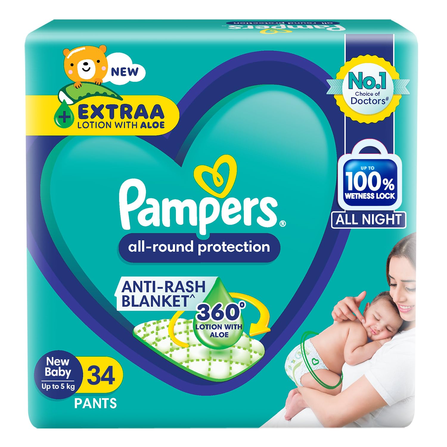 NEW IMPROVED Pampers all round protection pants have ANTI RASH BLANKET* containing Lotion with Aloe Vera to keep your baby skin protected from redness and rashes. Top quality diaper pants with Up to 100% WETNESS LOCK keeps the pee locked inside and baby's bum stays dry for ALL NIGHT. Air channels & stretchy belt provides your baby breathable airy fit comfortable even in summers. Pampers unique Magic gel technology provides up to 12 hours of dryness and has up to 2X faster absorption The new and improved design has an EXTRA SOFT material and a fit that adapts to baby movements for best comfort. Available in all sizes Small diapers medium diaper pants large size diaper pants XL diapers XXL diapers XXXL diaper pants. Our pants with fun exterior graphics fun designs of characters and a delightful fresh Aloe fragrance ensures you enjoy every change with your baby (*Blanket refers to soft topsheet with lotion Helps prevent rash due to wetness after 1 day of usage based on clinical studies in USA 2000 2019)