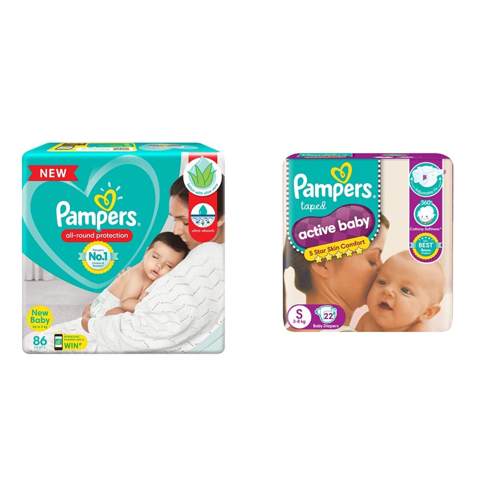 Pampers All round Protection Pants New Born Extra Small size baby diapers (NBXS) 86 Count Lotion with Aloe VeraNEW & IMPROVED Pampers all-round protection pants have ANTI-RASH BLANKET* containing Lotion with Aloe Vera to keep your baby skin protected from redness irritation and rashes. Best quality diapers with 100% WETNESS LOCK keeps the pee locked inside & baby's bum stays dry for ALL NIGHT. Air channels & stretchy belt provides your baby breathable airy fit - comfortable even in summers. Pampers unique Magic gel technology provides up to 12 hours of dryness and has 2X faster absorption. The new and improved product design enables a comfortable fit closer to the baby body and an EXTRA SOFT flexible waist band that adapts to baby movements for best comfort. Available in all sizes Small diapers medium diaper pants large size diaper pants XL diapers XXL diapers XXXL diaper pants. A top layer with cotton-like soft material ensure a comfortable night sleep. Our pants with fun exterior graphics fun designs of characters and a delightful fresh Aloe fragrance ensures you enjoy every change with your baby. (*Blanket refers to soft topsheet with lotion. Helps prevent rash due to wetness after 1 day of usage based on clinical studies in USA 2000-2019).Pampers Active Baby Taped Diapers Small size Diapers (S) 22 count taped style custom fit5 Star Skin Protection: The Best tape style diapers from Pampers with an outer layer of cotton-like softness this baby diaper provides intense care to your baby's sensitive skin and protects it effectively from friction rash and redness. These soft and comfort fitting diapers with stretchable sides are best for your baby's rest and playtime. The diaper's fastening tape sticks multiple times thus ensuring it stays in place even after you fasten it after checking your baby's diaper. Protection and nourishment of your baby's skin are taken care of with extracts of moisturizing Aloe Vera lotion characteristic of these best baby diapers.. These diapers are ultra-thin thanks to the absorbent gel material (AGM) commonly known as Magic Gel. This magic gel core of Pampers diapers is highly effective in absorbing frequent wetness. Naturally your baby's skin remains dry for upto12 hours now no more frequent diaper changing or blow leaks for your little angel. Keep your baby's skin delicate with 5 star skin protection. Pampers Active Baby comes with 5 features in just one diaper. 12 hours dryness baby lotion cottony softness breathable cover and comfortable fit. 12 Hours Dryness Our driest diaper keeps baby's skin touchably dry for up to 12 hours. Baby Lotion This unique diaper is infused with baby lotion to help prevent diaper rash. Cottony Softness Keep baby's skin free from irritation with cotton-like softness. Breathable Cover Air circulates so baby's skin can breathe easily and stay wonderfully fresh. Comfortable Fit A flexible side stretch design keeps it snug and comfy whether baby is at rest or play. Diaper Sizer Five Features in One Diaper View Larger Comparison Chart View Larger Using Pampers Pants When to Change Right before or right after every feeding After every bowel movement Before bedtime When your baby wakes up When you go out with your baby How to Change Put the diaper under the baby's body. Pull the elastic side properly. Apply both sides in symmetrical position on landing zone. Adjust the cuff around legs on both sides.