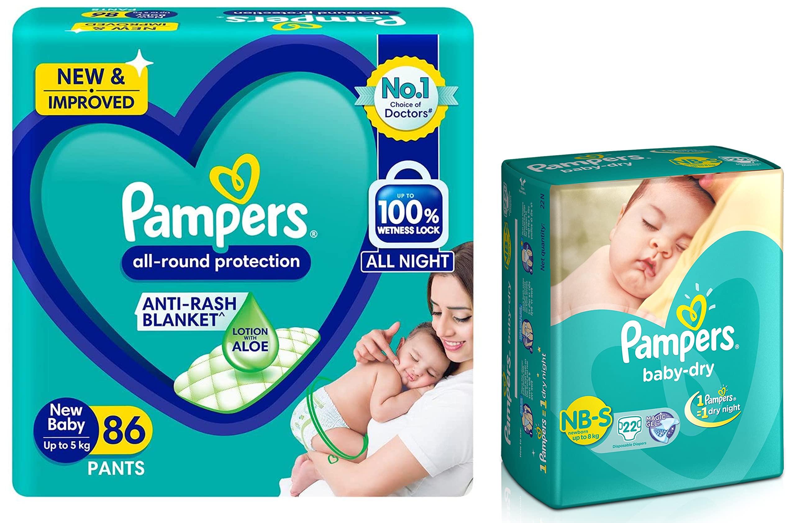 Pampers All round Protection Pants New Born Extra Small size baby diapers (NBXS) 86 Count Lotion with Aloe VeraNEW & IMPROVED Pampers all-round protection pants have ANTI-RASH BLANKET* containing Lotion with Aloe Vera to keep your baby’s skin protected from redness irritation and rashes. quality diapers with 100% WETNESS LOCK keeps the pee locked inside & baby's bum stays dry for ALL NIGHT. Air channels & stretchy belt provides your baby breathable airy fit - comfortable even in summers. Pampers unique Magic gel technology provides up to 12 hours of dryness – and has 2X faster absorption. The new and improved product design enables a comfortable fit closer to the baby’s body and an EXTRA SOFT flexible waist band that adapts to baby’s movements for best comfort. Available in all sizes – Small diapers medium diaper pants large size diaper pants XL diapers XXL diapers XXXL diaper pants. A top layer with cotton-like soft material ensure a comfortable night’s sleep. Our pants with fun exterior graphics fun designs of characters and a delightful fresh Aloe fragrance ensures you enjoy every change with your baby. (*Blanket refers to soft topsheet with lotion. Helps prevent rash due to wetness after 1 day of usage based on clinical studies in USA 2000-2019).Pampers Taped Baby Diapers Small (SM) 22 countNEW & IMPROVED Pampers all-round protection pants have ANTI-RASH BLANKET* containing Lotion with Aloe Vera to keep your baby’s skin protected from redness irritation and rashes. quality diapers with 100% WETNESS LOCK keeps the pee locked inside & baby's bum stays dry for ALL NIGHT. Air channels & stretchy belt provides your baby breathable airy fit - comfortable even in summers. Pampers unique Magic gel technology provides up to 12 hours of dryness – and has 2X faster absorption. The new and improved product design enables a comfortable fit closer to the baby’s body and an EXTRA SOFT flexible waist band that adapts to baby’s movements for best comfort. Available in all sizes – Small diapers medium diaper pants large size diaper pants XL diapers XXL diapers XXXL diaper pants. A top layer with cotton-like soft material ensure a comfortable night’s sleep. Our pants with fun exterior graphics fun designs of characters and a delightful fresh Aloe fragrance ensures you enjoy every change with your baby. (*Blanket refers to soft topsheet with lotion. Helps prevent rash due to wetness after 1 day of usage based on clinical studies in USA 2000-2019). JAS14 – Pants Win in top tier Pants via Superiority vs. key competition Product Innovation Dryness improvement with core boost Improved ease of application & fit via improved belt design Improved aesthetics via thinner product & improved graphics (Product demo vs. competition-absorbency speed rewet wring) Improved Packaging for Shop ability Pampers Icon – Brand - Findability Clear Sub Brand – Form difference Clear Consumer Icons – Size & count preference