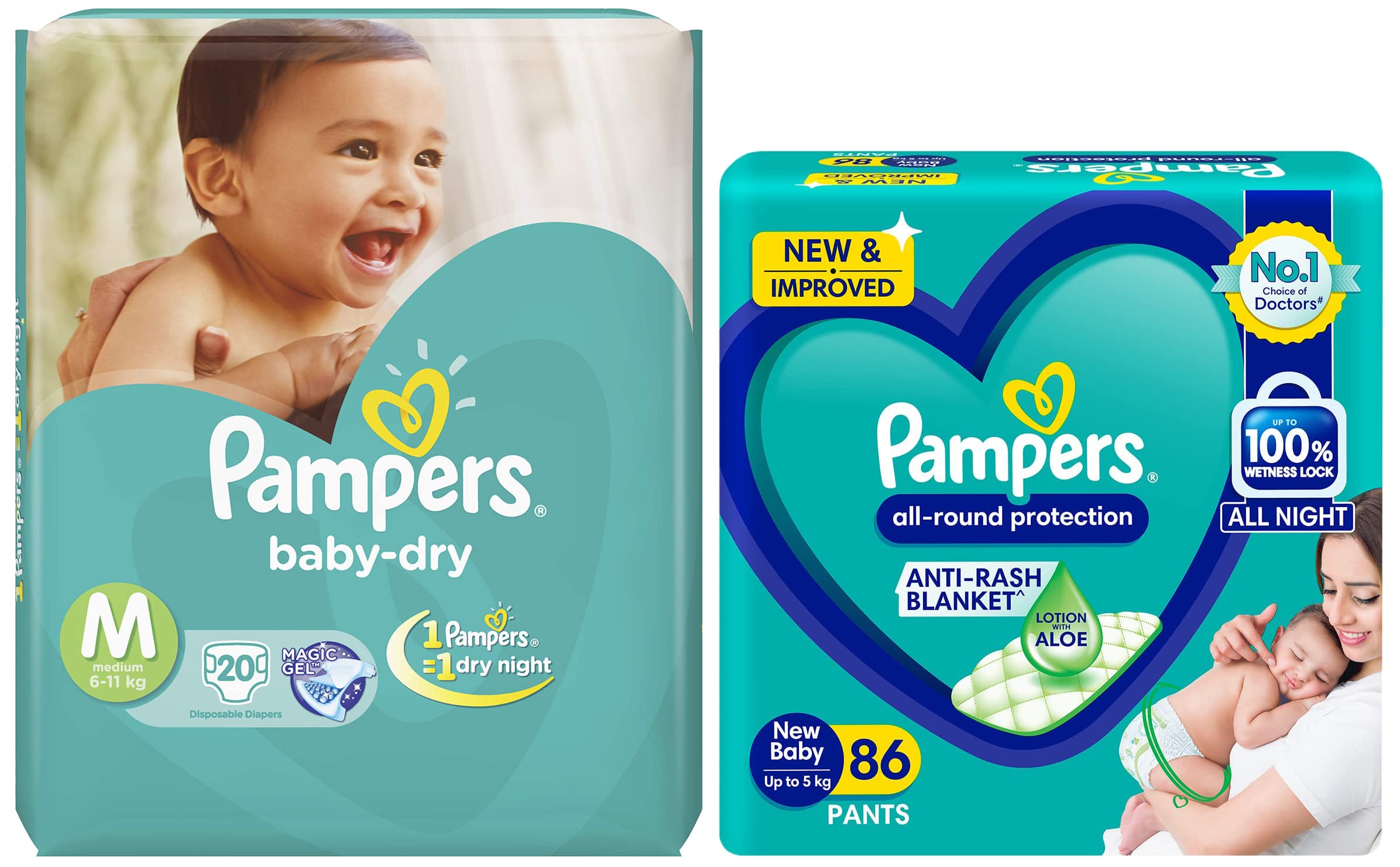 Pampers All round Protection Pants New Born Extra Small size baby diapers (NBXS) 86 Count Lotion with Aloe VeraNEW IMPROVED Pampers all round protection pants have ANTI RASH BLANKET* containing Lotion with Aloe Vera to keep your baby’s skin protected from redness and rashes. Top quality diaper pants with Up to 100% WETNESS LOCK keeps the pee locked inside and baby's bum stays dry for ALL NIGHT. Air channels & stretchy belt provides your baby breathable airy fit comfortable even in summers. Pampers unique Magic gel technology provides up to 12 hours of dryness and has up to 2X faster absorption The new and improved design has an EXTRA SOFT material and a fit that adapts to baby’s movements for best comfort. Available in all sizes Small diapers medium diaper pants large size diaper pants XL diapers XXL diapers XXXL diaper pants. Our pants with fun exterior graphics fun designs of characters and a delightful fresh Aloe fragrance ensures you enjoy every change with your baby (*Blanket refers to soft topsheet with lotion Helps prevent rash due to wetness after 1 day of usage based on clinical studies in USA 2000 2019)Pampers Taped Diapers Medium (MD) 20 countNEW & IMPROVED Pampers all-round protection pants have ANTI-RASH BLANKET* containing Lotion with Aloe Vera to keep your baby’s skin protected from redness irritation and rashes. quality diapers with 100% WETNESS LOCK keeps the pee locked inside & baby's bum stays dry for ALL NIGHT. Air channels & stretchy belt provides your baby breathable airy fit - comfortable even in summers. Pampers unique Magic gel technology provides up to 12 hours of dryness – and has 2X faster absorption. The new and improved product design enables a comfortable fit closer to the baby’s body and an EXTRA SOFT flexible waist band that adapts to baby’s movements for best comfort. Available in all sizes – Small diapers medium diaper pants large size diaper pants XL diapers XXL diapers XXXL diaper pants. A top layer with cotton-like soft material ensure a comfortable night’s sleep. Our pants with fun exterior graphics fun designs of characters and a delightful fresh Aloe fragrance ensures you enjoy every change with your baby. (*Blanket refers to soft topsheet with lotion. Helps prevent rash due to wetness after 1 day of usage based on clinical studies in USA 2000-2019).