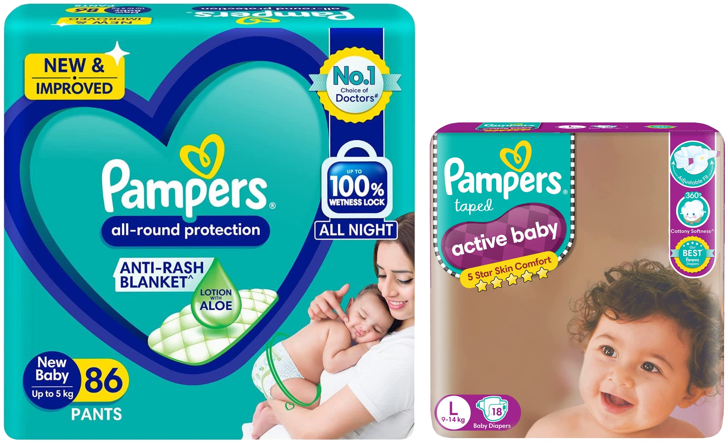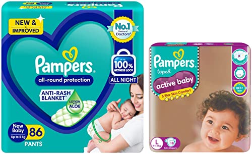 Pampers All round Protection Pants New Born Extra Small size baby diapers (NBXS) 86 Count Lotion with Aloe VeraNEW & IMPROVED Pampers all-round protection pants have ANTI-RASH BLANKET* containing Lotion with Aloe Vera to keep your baby’s skin protected from redness irritation and rashes. quality diapers with 100% WETNESS LOCK keeps the pee locked inside & baby's bum stays dry for ALL NIGHT. Air channels & stretchy belt provides your baby breathable airy fit - comfortable even in summers. Pampers unique Magic gel technology provides up to 12 hours of dryness – and has 2X faster absorption. The new and improved product design enables a comfortable fit closer to the baby’s body and an EXTRA SOFT flexible waist band that adapts to baby’s movements for best comfort. Available in all sizes – Small diapers medium diaper pants large size diaper pants XL diapers XXL diapers XXXL diaper pants. A top layer with cotton-like soft material ensure a comfortable night’s sleep. Our pants with fun exterior graphics fun designs of characters and a delightful fresh Aloe fragrance ensures you enjoy every change with your baby. (*Blanket refers to soft topsheet with lotion. Helps prevent rash due to wetness after 1 day of usage based on clinical studies in USA 2000-2019).Pampers Active Baby Taped Diapers Large size diapers (L) 18 count taped style custom fit5 Star Skin Protection: The Best tape style diapers from Pampers with an outer layer of cotton-like softness this baby diaper provides intense care to your baby's sensitive skin and protects it effectively from friction rash and redness. These soft and comfort fitting diapers with stretchable sides are best for your baby's rest and playtime. The diaper's fastening tape sticks multiple times thus ensuring it stays in place even after you fasten it after checking your baby's diaper. Protection and nourishment of your baby's skin are taken care of with extracts of moisturizing Aloe Vera lotion characteristic of these best baby diapers.. These diapers are ultra-thin thanks to the absorbent gel material (AGM) commonly known as Magic Gel. This magic gel core of Pampers diapers is highly effective in absorbing frequent wetness. Naturally your baby's skin remains dry for upto12 hours now no more frequent diaper changing or blow leaks for your little angel.