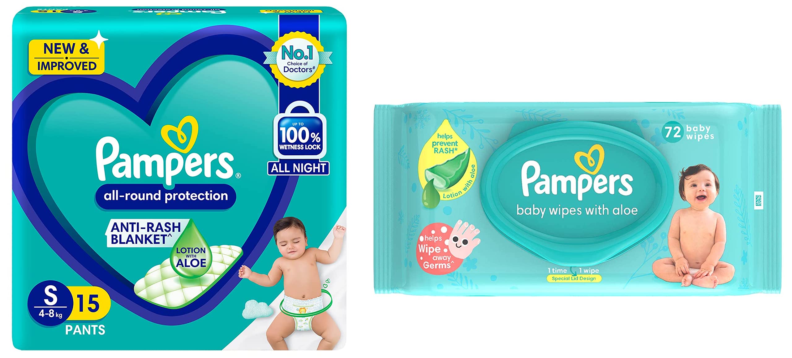 Pampers All round Protection Pants Small size baby Diapers (S) 15 Count Lotion with Aloe VeraNEW & IMPROVED Pampers all-round protection pants have ANTI-RASH BLANKET* containing Lotion with Aloe Vera to keep your baby skin protected from redness irritation and rashes. quality diapers with 100% WETNESS LOCK keeps the pee locked inside & baby's bum stays dry for ALL NIGHT. Air channels & stretchy belt provides your baby breathable airy fit - comfortable even in summers. Pampers unique Magic gel technology provides up to 12 hours of dryness and has 2X faster absorption. The new and improved product design enables a comfortable fit closer to the baby body and an EXTRA SOFT flexible waist band that adapts to baby movements for best comfort. Available in all sizes Small diapers medium diaper pants large size diaper pants XL diapers XXL diapers XXXL diaper pants. A top layer with cotton-like soft material ensure a comfortable night sleep. Our pants with fun exterior graphics fun designs of characters and a delightful fresh Aloe fragrance ensures you enjoy every change with your baby. (*Blanket refers to soft topsheet with lotion. Helps prevent rash due to wetness after 1 day of usage based on clinical studies in USA 2000-2019).Pampers Baby Aloe Wipes with Lid 72 WipesEvery little miracle deserves gentle protection mothers & doctors have always trusted Pampers to provide the care. Presenting Pampers Baby Wipes with Aloe which have the goodness of lotion with Aloe vera to protect against skin rashes & redness. Containing 97% pure water Pampers Wipes provide mild cleaning for baby supples skin just like cotton & water. Pampers wipes are safe as they are paraben-free and infused with Vitamin-E. They help restore the natural pH of your baby skin keeping it healthy and nourished. Pampers wipes are thick soft and strong ensuring a perfect gentle cleaning for the baby skin. Lastly the wipes come with a refreshing mild fragrance that you and your baby will surely love. Wet wipes tissues with lid 72 pcs combo pack.