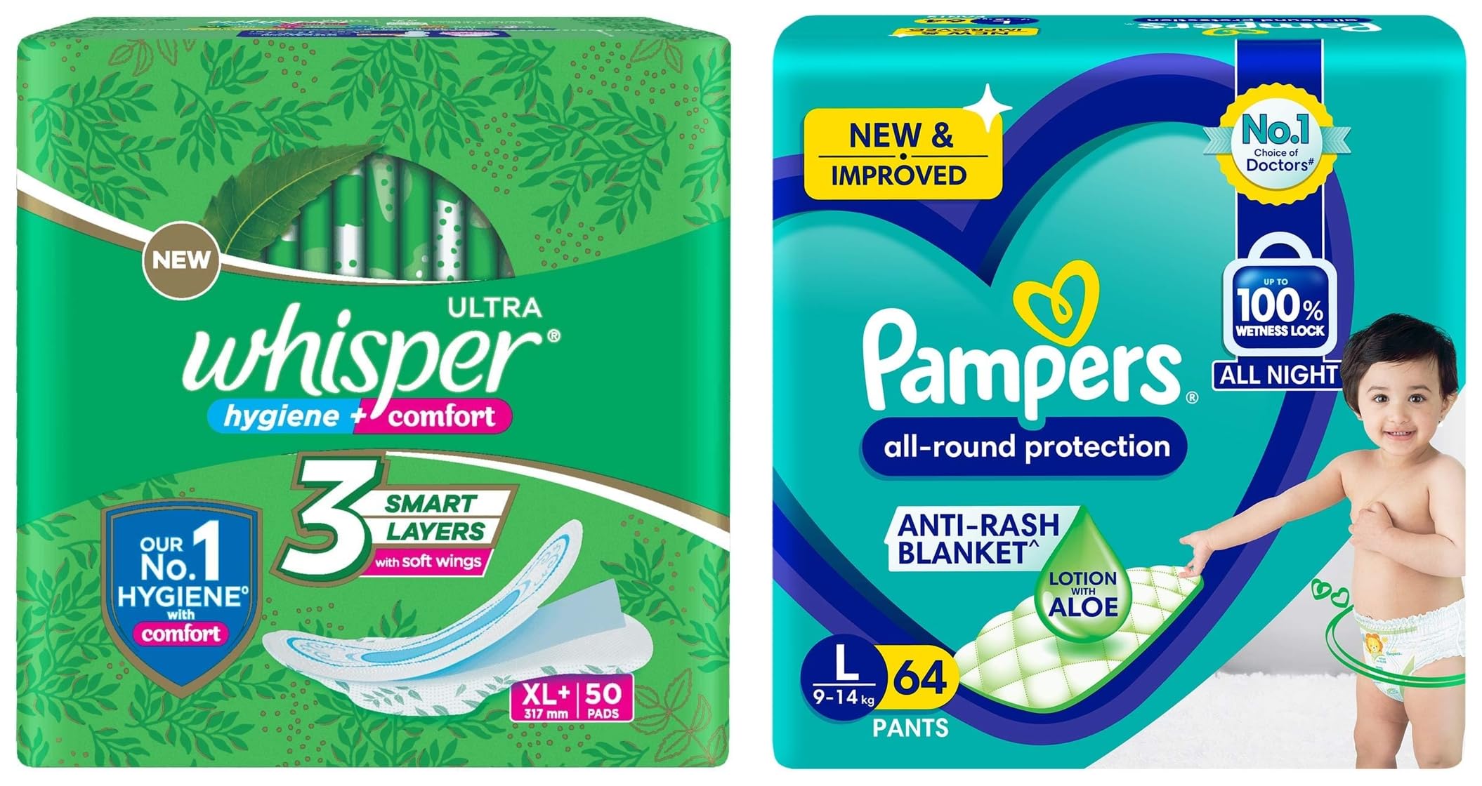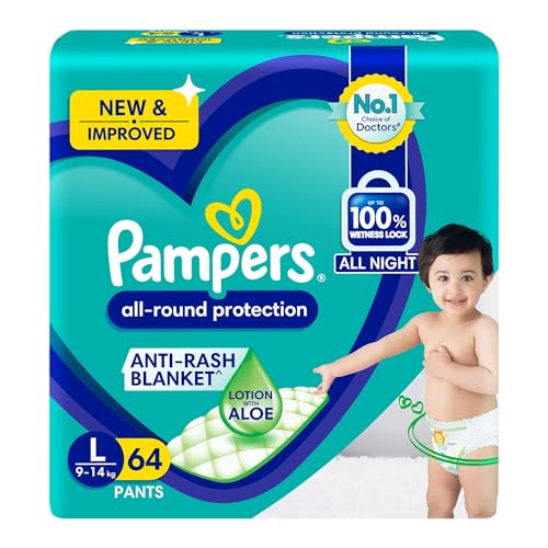 Pampers All round Protection Pants Style Baby Diapers Large (L) Size 64 Count Anti Rash Blanket Lotion with Aloe Vera 9-14kg DiapersPampers All Round Protection Pant Style Baby Diapers are available in New born (NB) Small (S) Medium (M) Large (L) X-Large (XL) XX-Large (XXL) XXX-Large (XXXL) sizes. NEW and IMPROVED Pampers all round protection pants have ANTI RASH BLANKET* containing Lotion with Aloe Vera to keep your baby’s skin protected from redness and rashes. Top quality diaper pants with Up to 100% WETNESS LOCK keeps the pee locked inside and baby's bum stays dry for ALL NIGHT. Air channels & stretchy belt provides your baby breathable airy fit comfortable even in summers. Pampers unique Magic gel technology provides up to 12 hours of dryness and has up to 2X faster absorption The new and improved design has an EXTRA SOFT material and a fit that adapts to baby’s movements for best comfort. Our pants with fun exterior graphics fun designs of characters and a delightful fresh Aloe fragrance ensures you enjoy every change with your baby (*Blanket refers to soft topsheet with lotion Helps prevent rash due to wetness after 1 day of usage based on clinical studies in USA 2000 2019)Whisper Ultra Clean Sanitary Pads for Women|50 thin Pads|XL+|Hygiene & Comfort|Soft Wings|Dry top sheet|Suitable for Heavy flow|Odour free|31.7 cm Long|With disposable wrapWhisper Ultra Clean is our No 1 Hygienic Protection Range now with Herbal Oil and locks not just wetness but also odour. The pads are nearly 40% longer versus ordinary pads for long lasting coverage and have a DRI weave cover that absorbs in seconds with a delightful scent for all day freshness