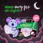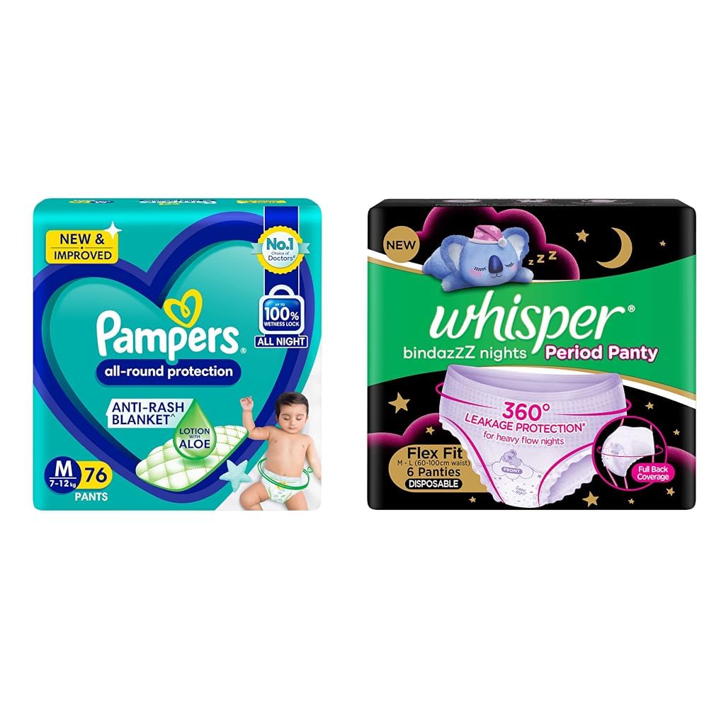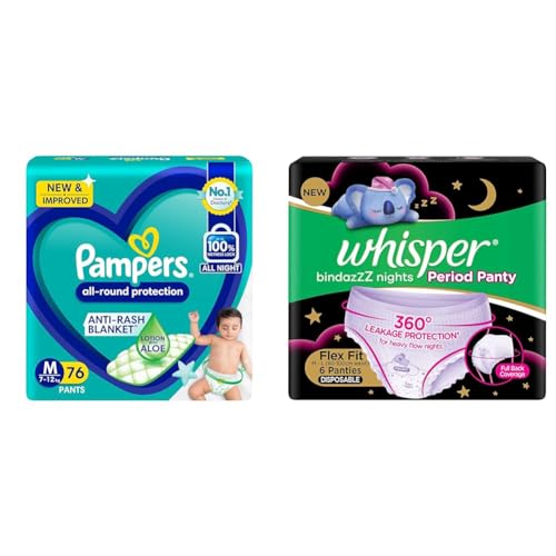 Pampers All round Protection Pants Style Baby Diapers Medium (M) Size 76 Count Anti Rash Blanket Lotion with Aloe Vera 7-12kg DiapersPampers All Round Protection Pant Style Baby Diapers are available in New born (NB) Small (S) Medium (M) Large (L) X-Large (XL) XX-Large (XXL) XXX-Large (XXXL) sizes. NEW and IMPROVED Pampers all round protection pants have ANTI RASH BLANKET* containing Lotion with Aloe Vera to keep your baby’s skin protected from redness and rashes. Top quality diaper pants with Up to 100% WETNESS LOCK keeps the pee locked inside and baby's bum stays dry for ALL NIGHT. Air channels & stretchy belt provides your baby breathable airy fit comfortable even in summers. Pampers unique Magic gel technology provides up to 12 hours of dryness and has up to 2X faster absorption The new and improved design has an EXTRA SOFT material and a fit that adapts to baby’s movements for best comfort. Our pants with fun exterior graphics fun designs of characters and a delightful fresh Aloe fragrance ensures you enjoy every change with your baby (*Blanket refers to soft topsheet with lotion Helps prevent rash due to wetness after 1 day of usage based on clinical studies in USA 2000 2019)Whisper Bindazzz Night Period Panty|6 M-L Panties|upto 0% Leaks|360 degree leakage protection|Full back coverage|Suitable for Heavy Flow|Flex fit|Soft & comfortable|With disposable wrapWhisper Bindazzz Nights Period Panty gives you 360-degree leakage protection for your heavy flow nights. It offers you full back coverage for a worry-free sleep. Its panty-like fit lets you sleep in any position you want. Whisper Bindazzz Nights Period Panties are soft & comfortable and gives you 360-degree coverage so you have no worry of stains.