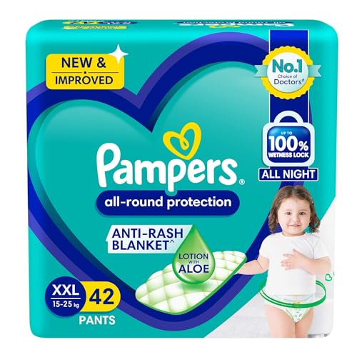 Pampers All round Protection Pants Style Baby Diapers XX-large (XXL) Size 42 Count Anti Rash Blanket Lotion with Aloe Vera 15-25kg DiapersPampers All Round Protection Pant Style Baby Diapers are available in New born (NB) Small (S) Medium (M) Large (L) X-Large (XL) XX-Large (XXL) XXX-Large (XXXL) sizes. NEW and IMPROVED Pampers all round protection pants have ANTI RASH BLANKET* containing Lotion with Aloe Vera to keep your baby’s skin protected from redness and rashes. Top quality diaper pants with Up to 100% WETNESS LOCK keeps the pee locked inside and baby's bum stays dry for ALL NIGHT. Air channels & stretchy belt provides your baby breathable airy fit comfortable even in summers. Pampers unique Magic gel technology provides up to 12 hours of dryness and has up to 2X faster absorption The new and improved design has an EXTRA SOFT material and a fit that adapts to baby’s movements for best comfort. Our pants with fun exterior graphics fun designs of characters and a delightful fresh Aloe fragrance ensures you enjoy every change with your baby (*Blanket refers to soft topsheet with lotion Helps prevent rash due to wetness after 1 day of usage based on clinical studies in USA 2000 2019)Whisper Ultra Clean Sanitary Pads for Women|50 thin Pads|XL+|Hygiene & Comfort|Soft Wings|Dry top sheet|Suitable for Heavy flow|Odour free|31.7 cm Long|With disposable wrapWhisper Ultra Clean is our No 1 Hygienic Protection Range now with Herbal Oil and locks not just wetness but also odour. The pads are nearly 40% longer versus ordinary pads for long lasting coverage and have a DRI weave cover that absorbs in seconds with a delightful scent for all day freshness