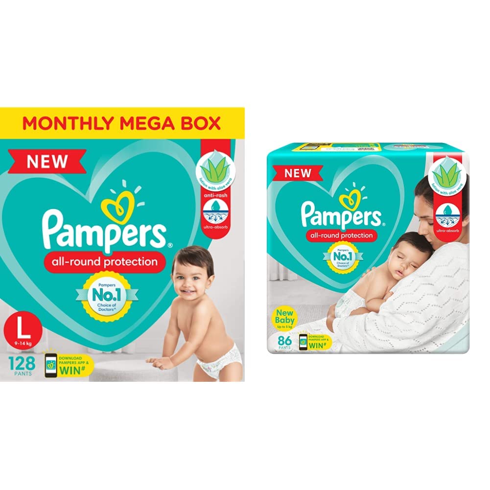 Pampers Baby Dry Pants Diapers Monthly Mega Box Large 128 CountPampers Baby-Dry pants style diapers are the only pants in India with Ultra Absorb Core Double Leak Guards and Lotion with Aloe Vera. Ultra Absorb Core provides your baby a new type of dryness overnight - breathable dryness. Magic gel locks wetness away to provide up to 12 hours of dryness. Now infused with baby lotion that has Aloe Vera helps protect your baby’s delicate skin from diaper rash and irritation. The new and improved product design enables a comfortable fit closer to the baby’s body and a flexible waist band that adapts to baby’s movements for a comfortable fit. A top layer with cotton-like soft material ensure a comfortable night’s sleep. Our pants with fun exterior graphics fun designs and characters ensure you enjoy with your baby.Pampers Diaper Pants Baby 86 CountPampers Baby-Dry pants style diapers are the only pants in India with Ultra Absorb Core Double Leak Guards and Lotion with Aloe Vera. Ultra Absorb Core provides your baby a new type of dryness overnight - breathable dryness. Magic gel locks wetness away to provide up to 12 hours of dryness. Now infused with baby lotion that has Aloe Vera helps protect your baby’s delicate skin from diaper rash and irritation. The new and improved product design enables a comfortable fit closer to the baby’s body and a flexible waist band that adapts to baby’s movements for a comfortable fit. A top layer with cotton-like soft material ensure a comfortable night’s sleep. Our pants with fun exterior graphics fun designs and characters ensure you enjoy with your baby.
