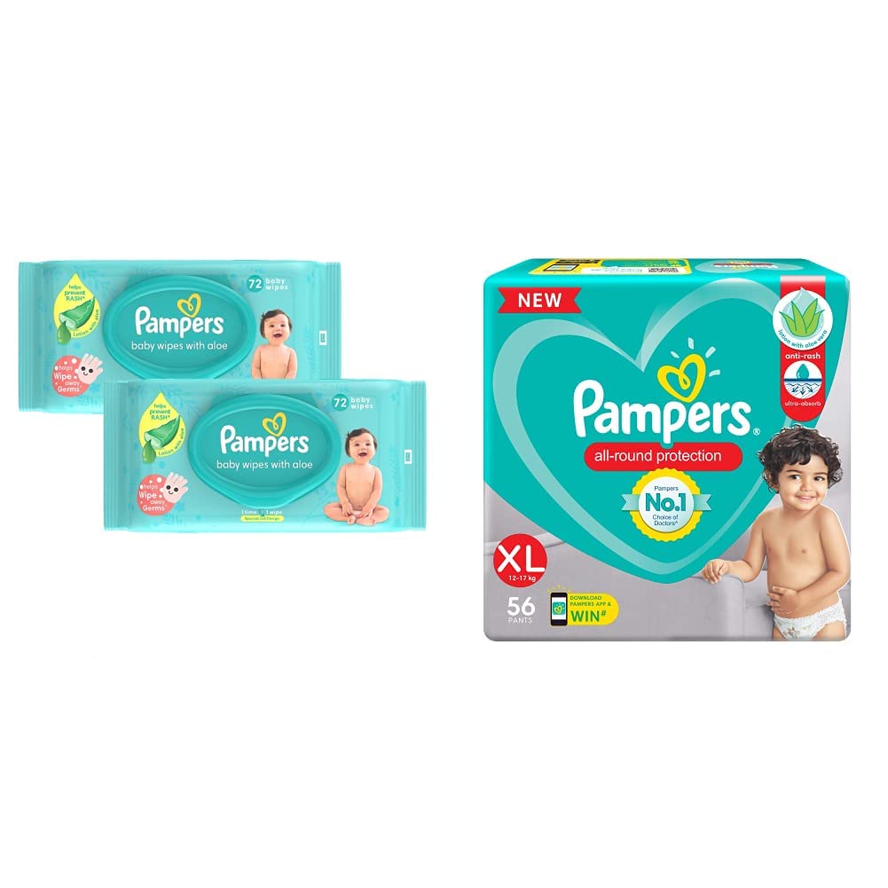 Pampers All round Protection Pants Extra Large size baby Diapers (XL) 56 Count Lotion with Aloe VeraNEW & IMPROVED Pampers all-round protection pants have ANTI-RASH BLANKET* containing Lotion with Aloe Vera to keep your baby’s skin protected from redness irritation and rashes. Best quality diapers with 100% WETNESS LOCK keeps the pee locked inside & baby's bum stays dry for ALL NIGHT. Air channels & stretchy belt provides your baby breathable airy fit - comfortable even in summers. Pampers unique Magic gel technology provides up to 12 hours of dryness – and has 2X faster absorption. The new and improved product design enables a comfortable fit closer to the baby’s body and an EXTRA SOFT flexible waist band that adapts to baby’s movements for best comfort. Available in all sizes – Small diapers medium diaper pants large size diaper pants XL diapers XXL diapers XXXL diaper pants. A top layer with cotton-like soft material ensure a comfortable night’s sleep. Our pants with fun exterior graphics fun designs of characters and a delightful fresh Aloe fragrance ensures you enjoy every change with your baby. (*Blanket refers to soft topsheet with lotion. Helps prevent rash due to wetness after 1 day of usage based on clinical studies in USA 2000-2019).Pampers Baby Gentle Wet Wipes with Aloe Vera 144 WipesEvery little miracle deserves gentle protection – mothers & doctors have always trusted Pampers to provide the care. Presenting Pampers Baby Wipes with Aloe which have the goodness of lotion with Aloe vera to protect against skin rashes & redness. Containing 97% pure water Pampers Wipes provide mild cleaning for baby’s supples skin just like cotton & water. Pampers wipes are safe as they are paraben-free and infused with Vitamin-E. They help restore the natural pH of your baby’s skin keeping it healthy and nourished. Pampers wipes are thick soft and strong ensuring a perfect gentle cleaning for the baby’s skin. Lastly the wipes come with a refreshing mild fragrance that you and your baby will surely love. Wet wipes tissues with lid 72 pcs combo pack.