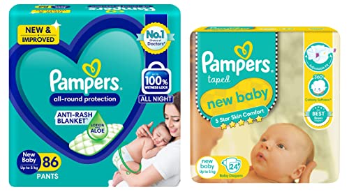 Pampers All round Protection Pants New Born Extra Small size baby diapers (NBXS) 86 Count Lotion with Aloe VeraNEW & IMPROVED Pampers all-round protection pants have ANTI-RASH BLANKET* containing Lotion with Aloe Vera to keep your baby skin protected from redness irritation and rashes. Best quality diapers with 100% WETNESS LOCK keeps the pee locked inside & baby's bum stays dry for ALL NIGHT. Air channels & stretchy belt provides your baby breathable airy fit - comfortable even in summers. Pampers unique Magic gel technology provides up to 12 hours of dryness and has 2X faster absorption. The new and improved product design enables a comfortable fit closer to the baby body and an EXTRA SOFT flexible waist band that adapts to baby movements for best comfort. Available in all sizes Small diapers medium diaper pants large size diaper pants XL diapers XXL diapers XXXL diaper pants. A top layer with cotton-like soft material ensure a comfortable night sleep. Our pants with fun exterior graphics fun designs of characters and a delightful fresh Aloe fragrance ensures you enjoy every change with your baby. (*Blanket refers to soft topsheet with lotion. Helps prevent rash due to wetness after 1 day of usage based on clinical studies in USA 2000-2019).Pampers Active Baby Diapers New Born Extra Small (NB XS) size 24 Count Taped style diaper5 Star Skin Protection: The Best tape style diapers from Pampers with an outer layer of cotton-like softness this baby diaper provides intense care to your baby's sensitive skin and protects it effectively from friction rash and redness. These soft and comfort fitting diapers with stretchable sides are best for your baby's rest and playtime. The diaper's fastening tape sticks multiple times thus ensuring it stays in place even after you fasten it after checking your baby's diaper. Protection and nourishment of your baby's skin are taken care of with extracts of moisturizing Aloe Vera lotion characteristic of these best baby diapers.. These diapers are ultra-thin thanks to the absorbent gel material (AGM) commonly known as Magic Gel. This magic gel core of Pampers diapers is highly effective in absorbing frequent wetness. Naturally your baby's skin remains dry for upto 12 hours now no more frequent diaper changing or blow leaks for your little angel.