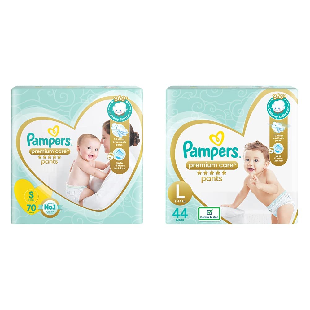 Pampers Premium Care Pants Diapers Small 70 CountNew Pampers premium pants with cotton like soft materials is best for your baby delicate skin. Pampers premium pants contain lotion with aloe vera and 3 air channels which helps your baby skin breathe. Experience 5 star comfort with unique added features like wetness indicator which turns yellow to blue indication when you may change and disposal tape which helps you in easy disposal of the diaper. Pampers is the no.1 choice of doctors for diapers. Pampers premium pants are available in new born (nb) s m l xl and xxl sizes.Pampers Premium Care Pants Diapers Large 44 CountNew Pampers Premium Pants with cotton like soft materials is best for your baby delicate skin. Pampers Premium Pants contain lotion with Aloe Vera and 3 Air Channels which helps your baby skin breathe. Experience 5 Star comfort with unique added features like Wetness Indicator which turns Yellow to Blue indication when you may change and Disposal Tape which helps you in easy disposal of the diaper. Pampers Premium Pants are available in New-born (NB) S M L XL and XXL sizes.