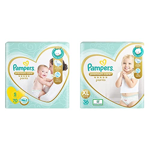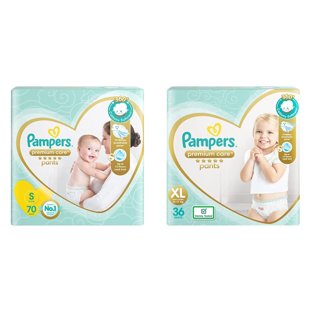 Pampers Premium Care Pants Diapers Small 70 CountNew Pampers premium pants with cotton like soft materials is best for your baby’s delicate skin. Pampers premium pants contain lotion with aloe vera and 3 air channels which helps your baby’s skin breathe. Experience 5 star comfort with unique added features like wetness indicator which turns yellow to blue indication when you may change and disposal tape which helps you in easy disposal of the diaper. Pampers is the no.1 choice of doctors for diapers. Pampers premium pants are available in new born (nb) s m l xl and xxl sizes.Pampers Premium Care Pants Diapers XL 36 CountNew Pampers Premium Pants with cotton like soft materials is best for your baby’s delicate skin. Pampers Premium Pants contain lotion with Aloe Vera and 3 Air Channels which helps your baby’s skin breathe. Experience 5 Star comfort with unique added features like Wetness Indicator which turns Yellow to Blue indication when you may change and Disposal Tape which helps you in easy disposal of the diaper. Pampers Premium Pants are available in New-born (NB) S M L XL and XXL sizes.