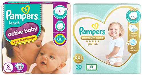 Pampers Premium Care Pants Double Extra Large size baby Diapers (XXL) 30 Count Softest ever Pampers PantsNew Pampers Premium Care Pants with 360 degree cottony softness gives your baby the ultimate comfort all day all night long. Pampers Premium Care Pants contain soothing lotion with Aloe Vera to protect your baby’s skin from rashes while its 10 million micropores allow your baby’s skin to breathe. Its 12-hour leak lock facility keeps your baby dry and away from wetness. Experience 5-Star comfort with unique added features like Wetness Indicator which turns Yellow to Blue indicating when you may change the diaper and a Disposal Tape to help you with easy disposal. Pampers Premium Pants are available in New-born (NB) S M L XL and XXL sizes.Pampers Active Baby Taped Diapers Small size Diapers (S) 22 count taped style custom fit5 Star Skin Protection: The Best tape style diapers from Pampers with an outer layer of cotton-like softness this baby diaper provides intense care to your baby's sensitive skin and protects it effectively from friction rash and redness. These soft and comfort fitting diapers with stretchable sides are best for your baby's rest and playtime. The diaper's fastening tape sticks multiple times thus ensuring it stays in place even after you fasten it after checking your baby's diaper. Protection and nourishment of your baby's skin are taken care of with extracts of moisturizing Aloe Vera lotion characteristic of these best baby diapers.. These diapers are ultra-thin thanks to the absorbent gel material (AGM) commonly known as Magic Gel. This magic gel core of Pampers diapers is highly effective in absorbing frequent wetness. Naturally your baby's skin remains dry for upto12 hours now no more frequent diaper changing or blow leaks for your little angel. Keep your baby's skin delicate with 5 star skin protection. Pampers Active Baby comes with 5 features in just one diaper. 12 hours dryness baby lotion cottony softness breathable cover and comfortable fit. 12 Hours Dryness Our driest diaper keeps baby's skin touchably dry for up to 12 hours. Baby Lotion This unique diaper is infused with baby lotion to help prevent diaper rash. Cottony Softness Keep baby's skin free from irritation with cotton-like softness. Breathable Cover Air circulates so baby's skin can breathe easily and stay wonderfully fresh. Comfortable Fit A flexible side stretch design keeps it snug and comfy whether baby is at rest or play. Diaper Sizer Five Features in One Diaper View Larger Comparison Chart View Larger Using Pampers Pants When to Change Right before or right after every feeding After every bowel movement Before bedtime When your baby wakes up When you go out with your baby How to Change Put the diaper under the baby's body. Pull the elastic side properly. Apply both sides in symmetrical position on landing zone. Adjust the cuff around legs on both sides.