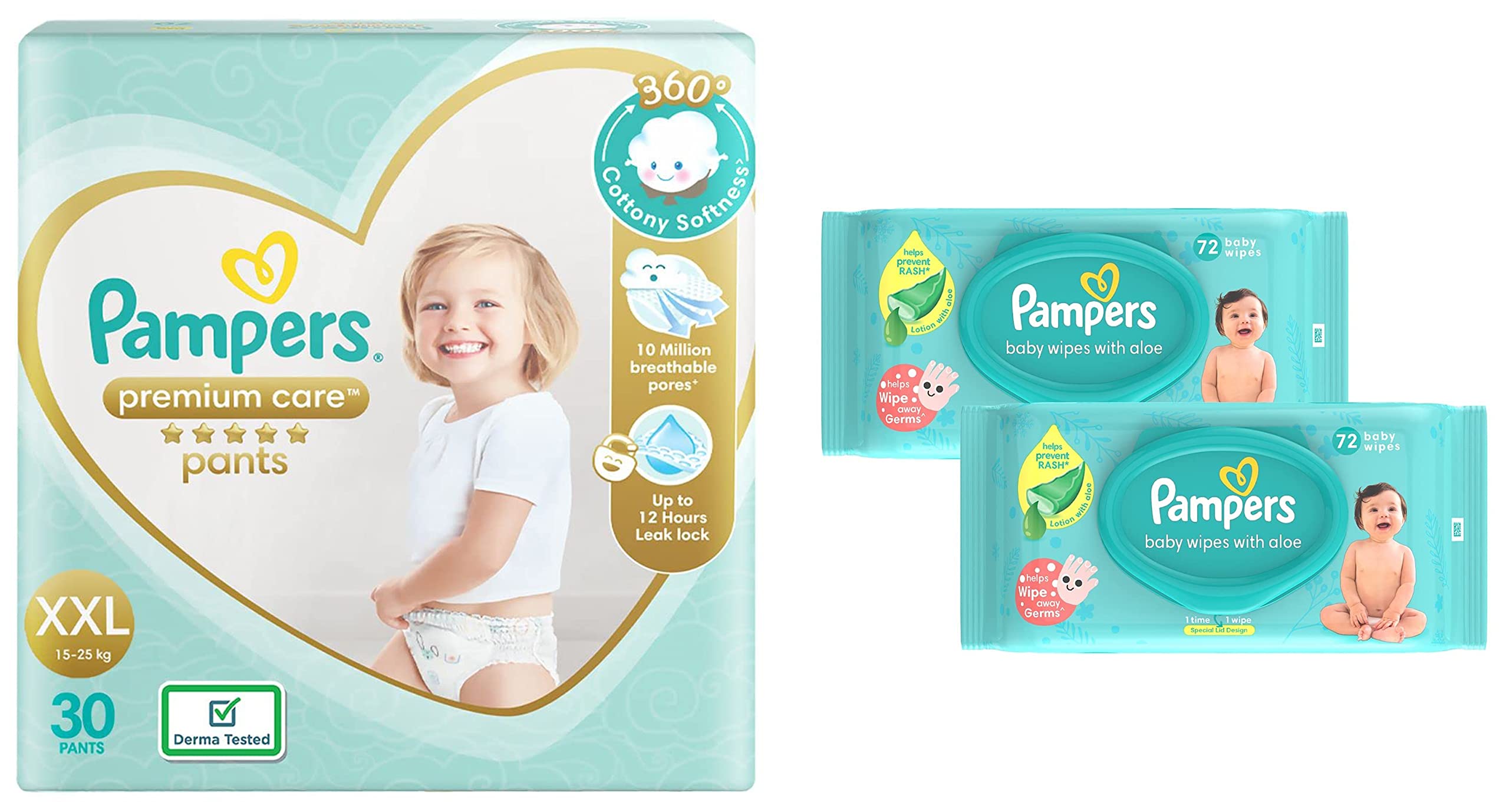 Pampers Premium Care Pants Double Extra Large size baby diapers (XXL) 30 Count Softest ever Pampers pantsNew Pampers Premium Care Pants with 360 degree cottony softness gives your baby the ultimate comfort all day all night long. Pampers Premium Care Pants contain soothing lotion with Aloe Vera to protect your baby skin from rashes while its 10 million micropores allow your baby skin to breathe. Its 12-hour leak lock facility keeps your baby dry and away from wetness. Experience 5-Star comfort with unique added features like Wetness Indicator which turns Yellow to Blue indicating when you may change the diaper and a Disposal Tape to help you with easy disposal. Pampers Premium Pants are available in New-born (NB) S M L XL and XXL sizes.Pampers Baby Aloe Wipes with Lid 72 WipesEvery little miracle deserves gentle protection mothers & doctors have always trusted Pampers to provide the care. Presenting Pampers Baby Wipes with Aloe which have the goodness of lotion with Aloe vera to protect against skin rashes & redness. Containing 97% pure water Pampers Wipes provide mild cleaning for baby supples skin just like cotton & water. Pampers wipes are safe as they are paraben-free and infused with Vitamin-E. They help restore the natural pH of your baby skin keeping it healthy and nourished. Pampers wipes are thick soft and strong ensuring a perfect gentle cleaning for the baby skin. Lastly the wipes come with a refreshing mild fragrance that you and your baby will surely love. Wet wipes tissues with lid 72 pcs combo pack.