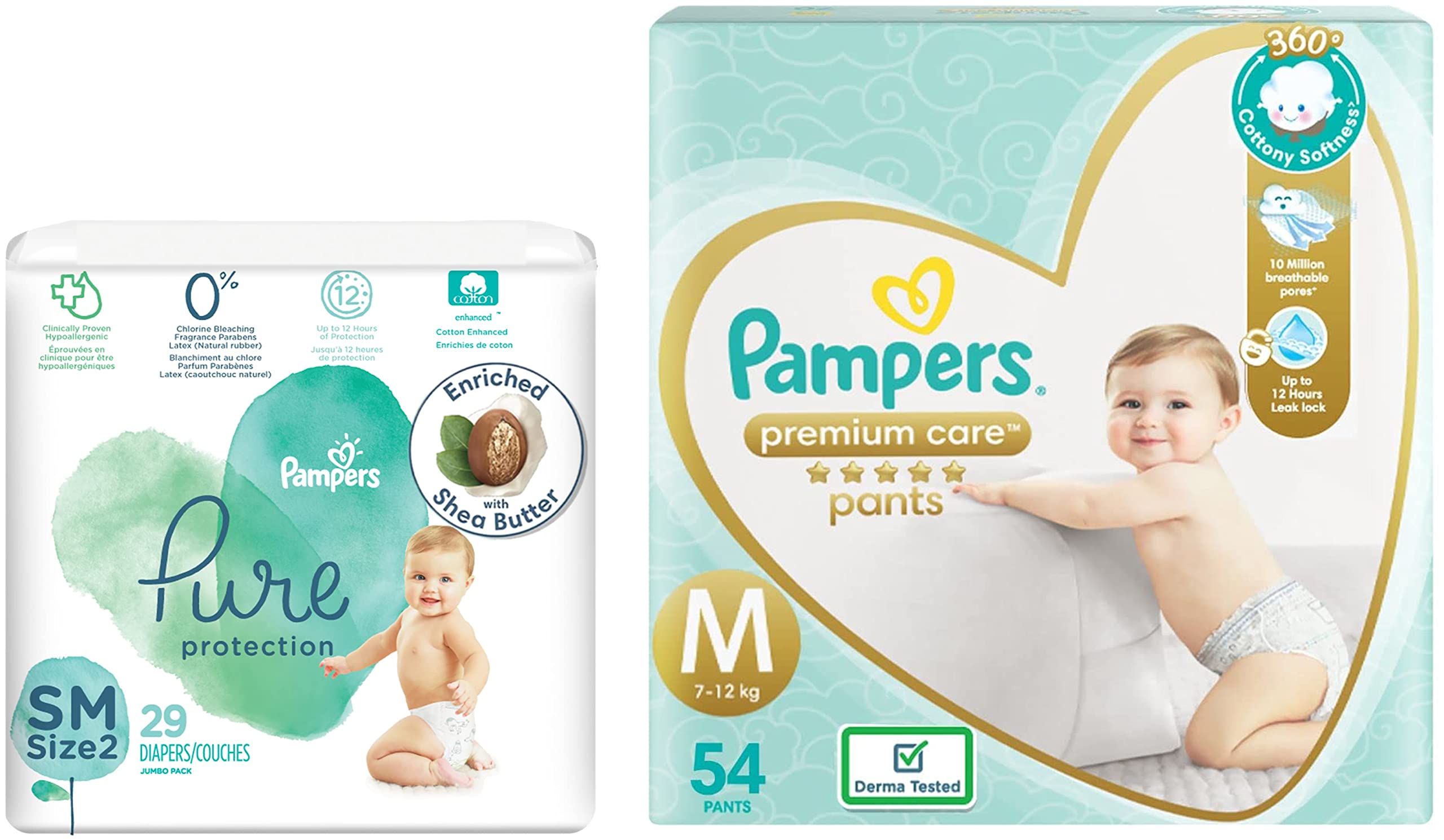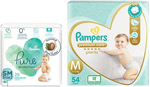 Pampers Premium Care Pants Medium size baby Diapers (M) 54 Count Softest ever Pampers PantsNew Pampers Premium Care Pants with 360 degree cottony softness gives your baby the ultimate comfort all day all night long. Pampers Premium Care Pants contain soothing lotion with Aloe Vera to protect your baby skin from rashes while its 10 million micropores allow your baby skin to breathe. Its 12-hour leak lock facility keeps your baby dry and away from wetness. Experience 5-Star comfort with unique added features like Wetness Indicator which turns Yellow to Blue indicating when you may change the diaper and a Disposal Tape to help you with easy disposal. Pampers Premium Pants are available in New-born (NB) S M L XL and XXL sizes.Pampers Pure Protection Baby Diapers Small Size Taped Diapers (SM) 29 Count [Hypoallergenic and unscented protection 0% chlorine paraben latex]Pampers Pure Protection Baby Diapers