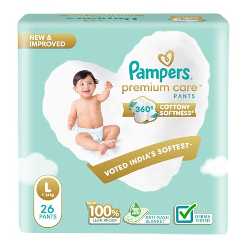 New Pampers Premium Care Pants with 360 degree cottony softness gives your baby the ultimate comfort all day all night long. Pampers Premium Care Pants contain soothing lotion with Aloe Vera to protect your baby skin from rashes while its 10 million micropores allow your baby skin to breathe. Its 12-hour leak lock facility keeps your baby dry and away from wetness. Experience 5-Star comfort with unique added features like Wetness Indicator which turns Yellow to Blue indicating when you may change the diaper and a Disposal Tape to help you with easy disposal. Pampers Premium Pants are available in New-born (NB) S M L XL and XXL sizes.
