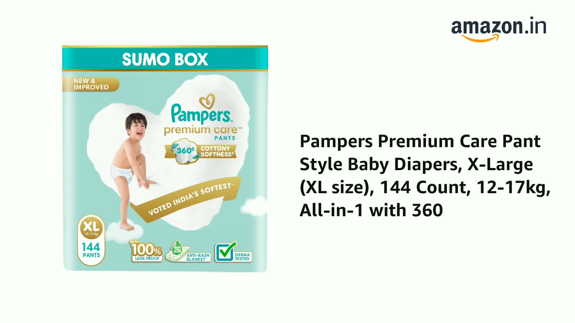 Pampers Premium Care Pant Style Baby Diapers, X-Large (XL size), 144 Count, 12-17kg, All-in-1 with 360