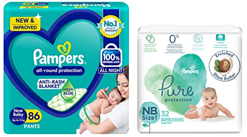 Pampers Pure Protection Baby Diapers Newborn Extra Small Size Taped Diapers (Size 1 NB) 32 Count [Hypo allergenic and unscented protection 0% chlorine paraben latex]Pampers Pure Protection diapers help protect your baby skin with 0% chlorine bleaching fragrance parabens and latex* and 100% Pampers protection. Crafted with premium cotton soft plant-based fibers and other thoughtfully selected materialstheyre clinically proven hypoallergenic for your baby delicate skin. Because your baby deserves skin-loving care without compromises Pampers Pure Protection delivers up to 12-hours of trusted leak protection. They have features you and your baby will love like adorable prints and our reassuring Wetness Indicator. And Pampers Pure Protection diapers are made with 100% certified renewable electricity and sustainably sourced fluff pulp. *Natural rubber latex The Seal of Cotton and cotton enhanced TM are trademarks of Cotton Incorporated. cotton enhanced TM soft outercover contains 15% cotton.Pampers Baby Aloe Wipes with Lid 72 WipesEvery little miracle deserves gentle protection mothers & doctors have always trusted Pampers to provide the care. Presenting Pampers Baby Wipes with Aloe which have the goodness of lotion with Aloe vera to protect against skin rashes & redness. Containing 97% pure water Pampers Wipes provide mild cleaning for baby supples skin just like cotton & water. Pampers wipes are safe as they are paraben-free and infused with Vitamin-E. They help restore the natural pH of your baby skin keeping it healthy and nourished. Pampers wipes are thick soft and strong ensuring a perfect gentle cleaning for the baby skin. Lastly the wipes come with a refreshing mild fragrance that you and your baby will surely love. Wet wipes tissues with lid 72 pcs combo pack.